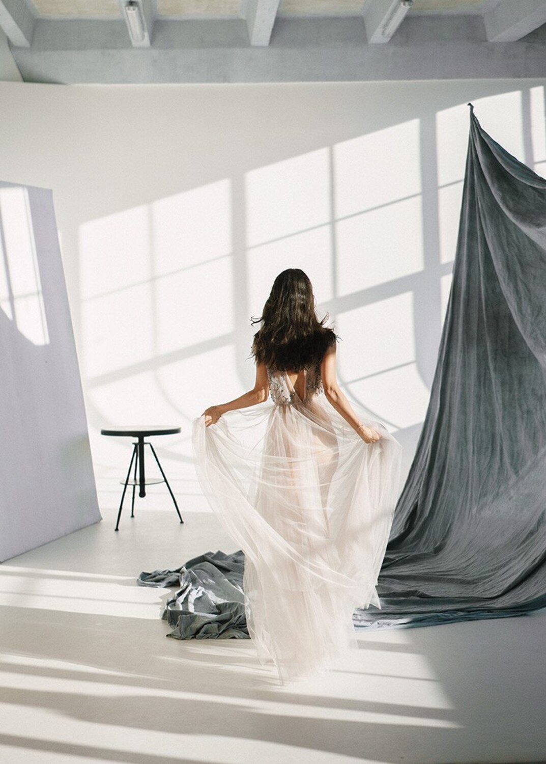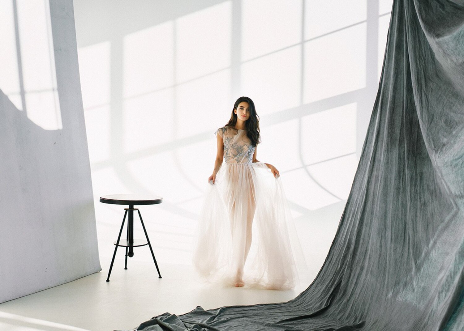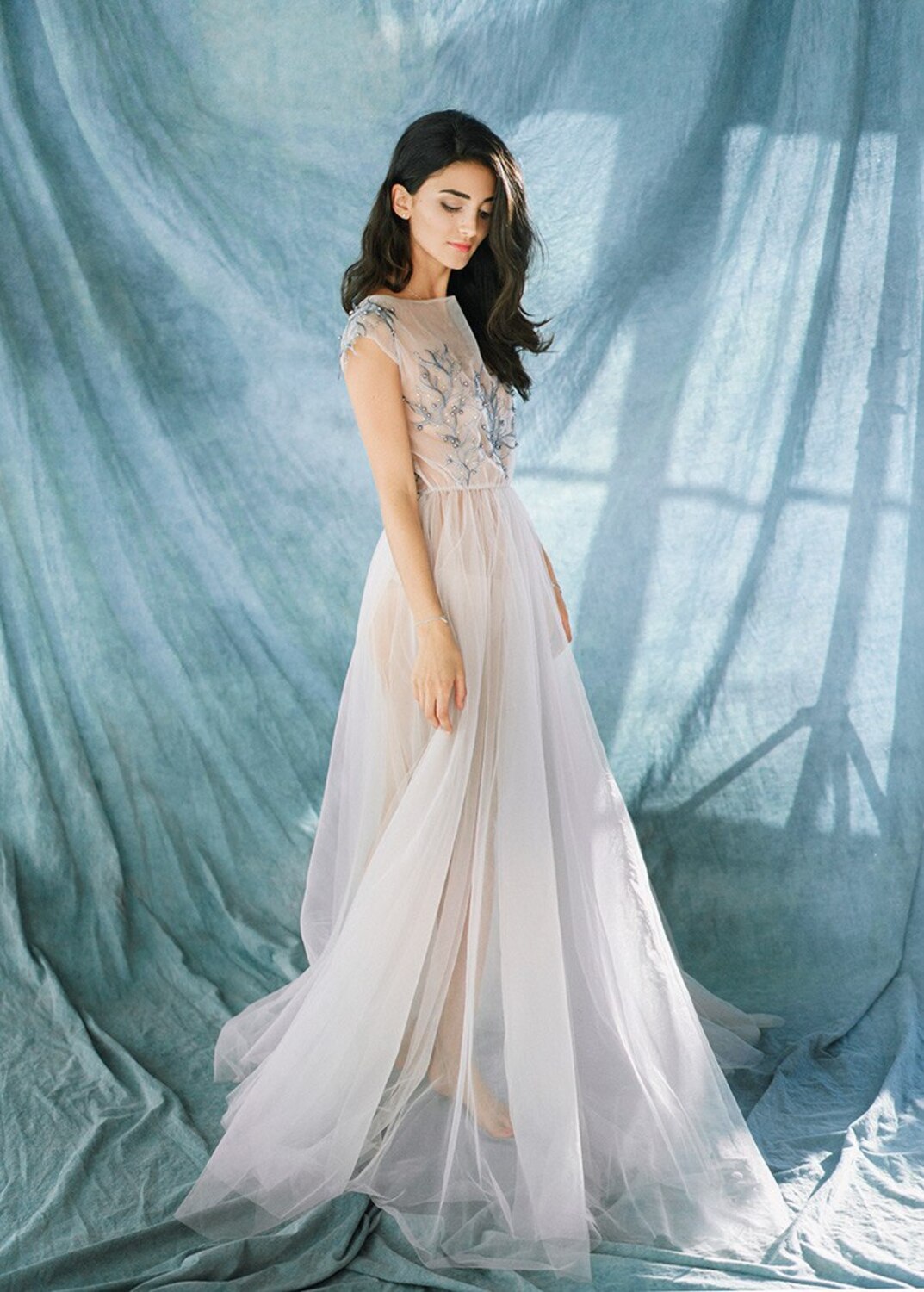 Boudoir dress “Jenna” is made of flimsy tulle and embroidered lace in gray shades.