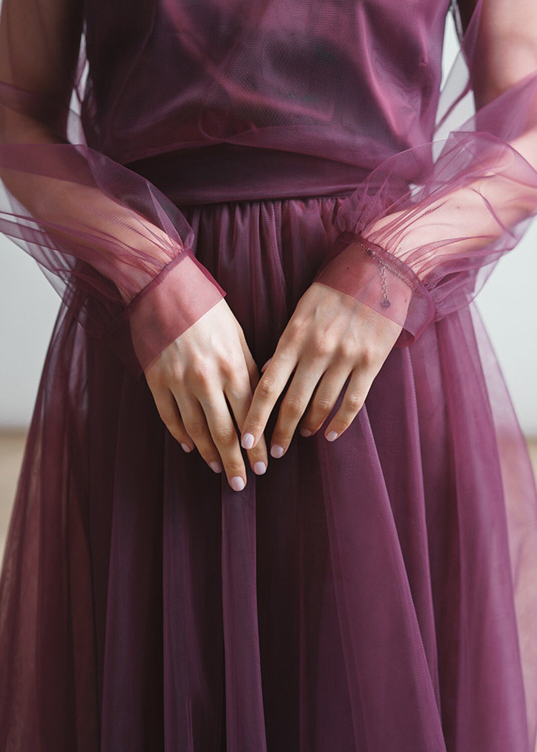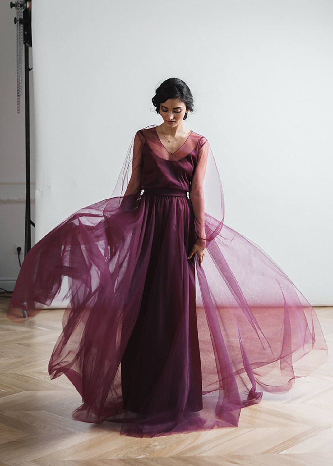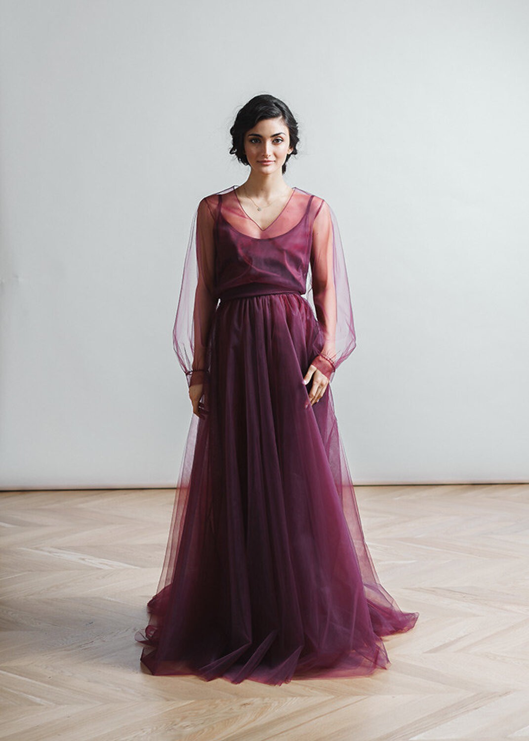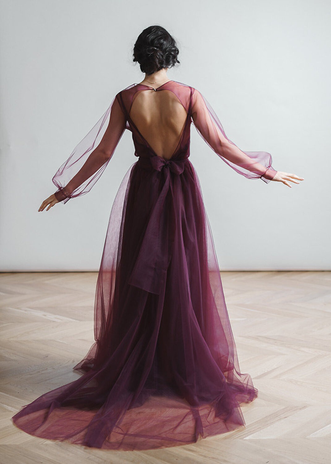 The light tulle dress in the color of eggplant, a beautiful open back and a sleeve in the shape of a flashlight. If you wear a basic dress down, then the product becomes an evening dress.