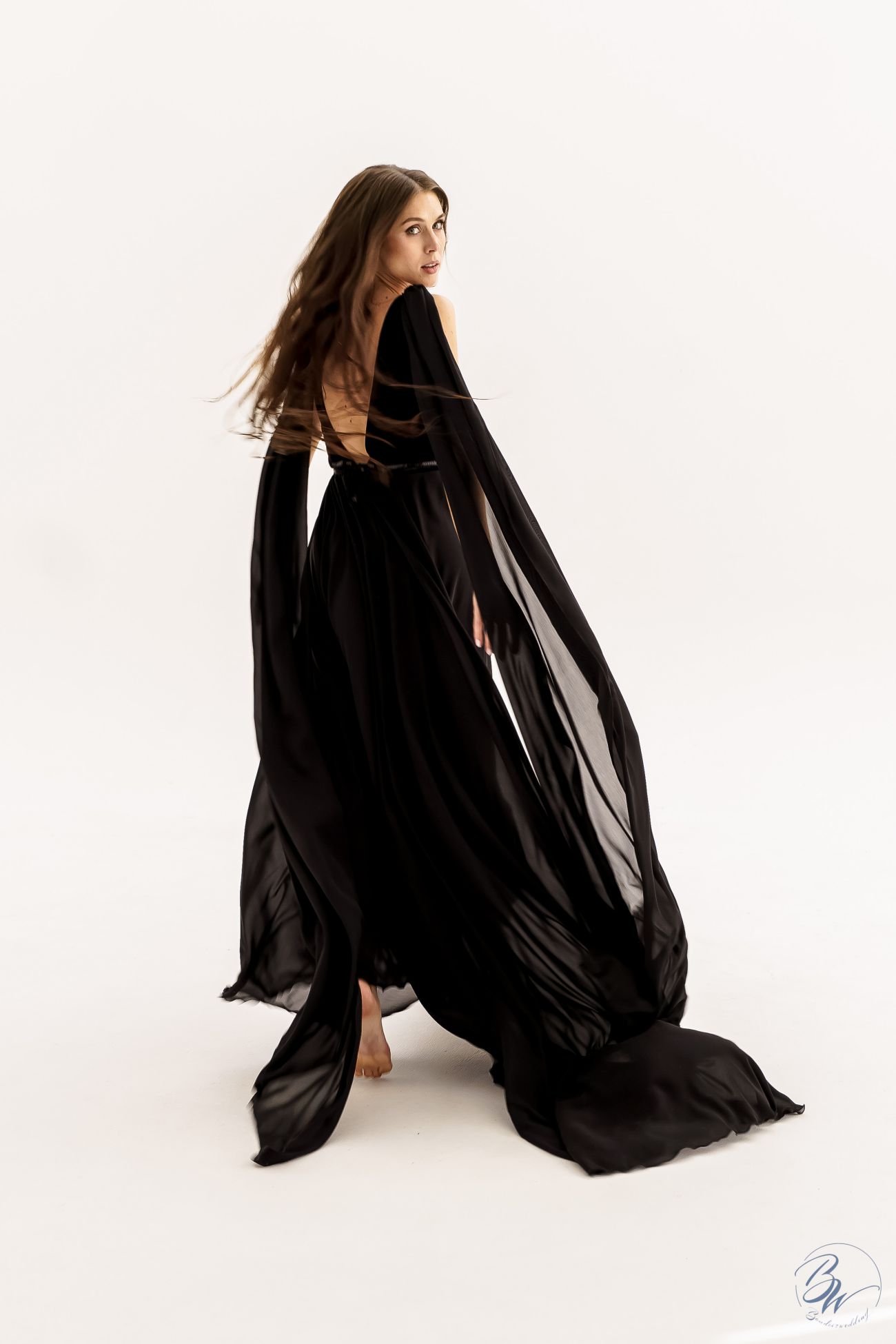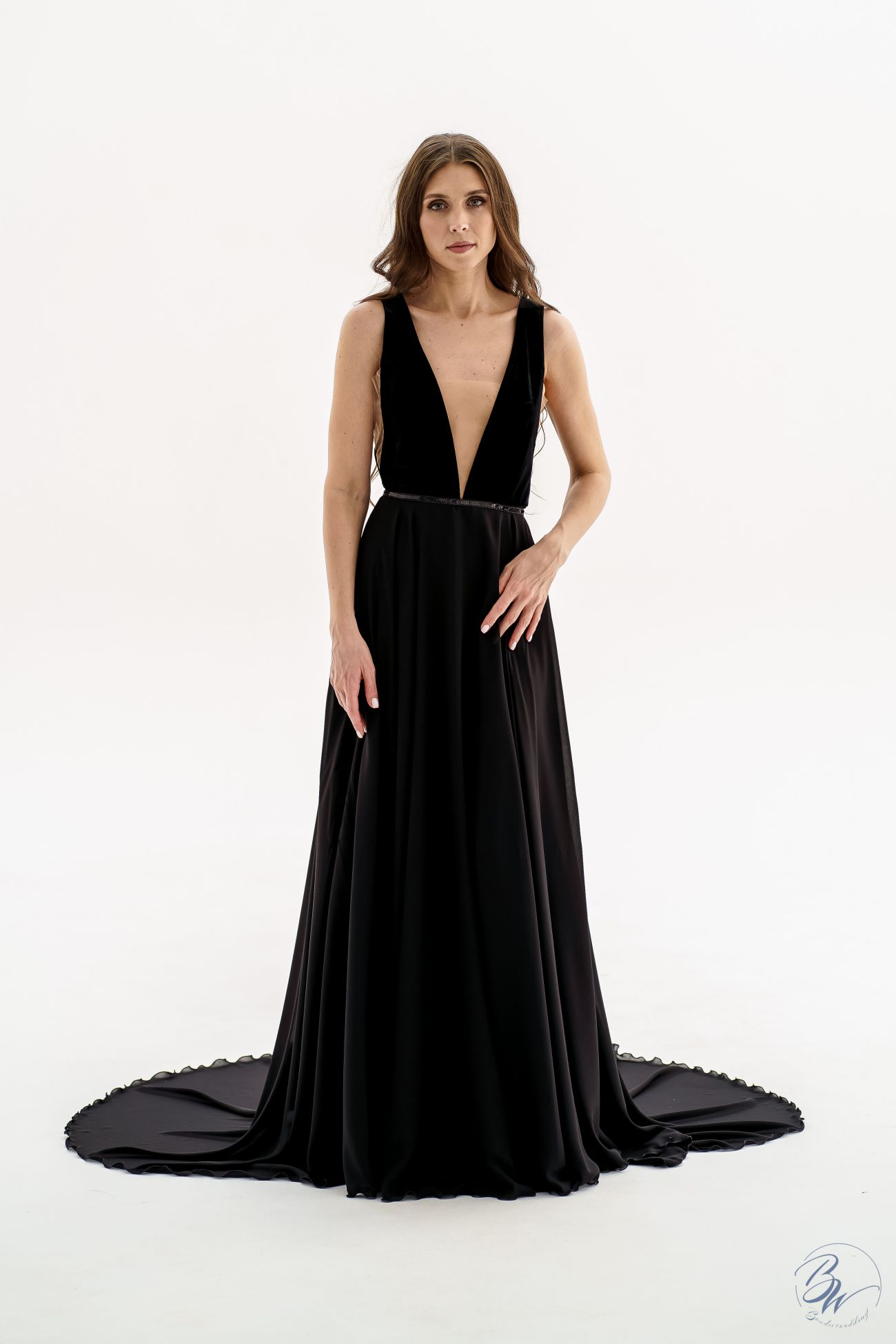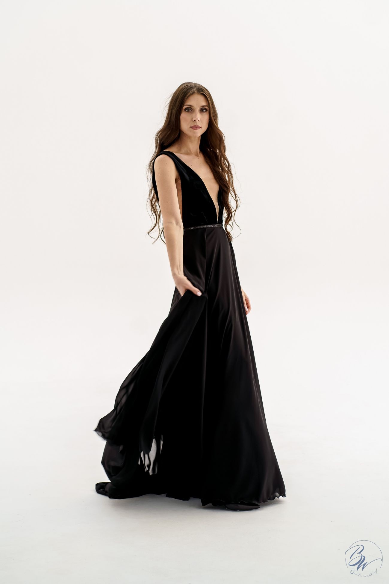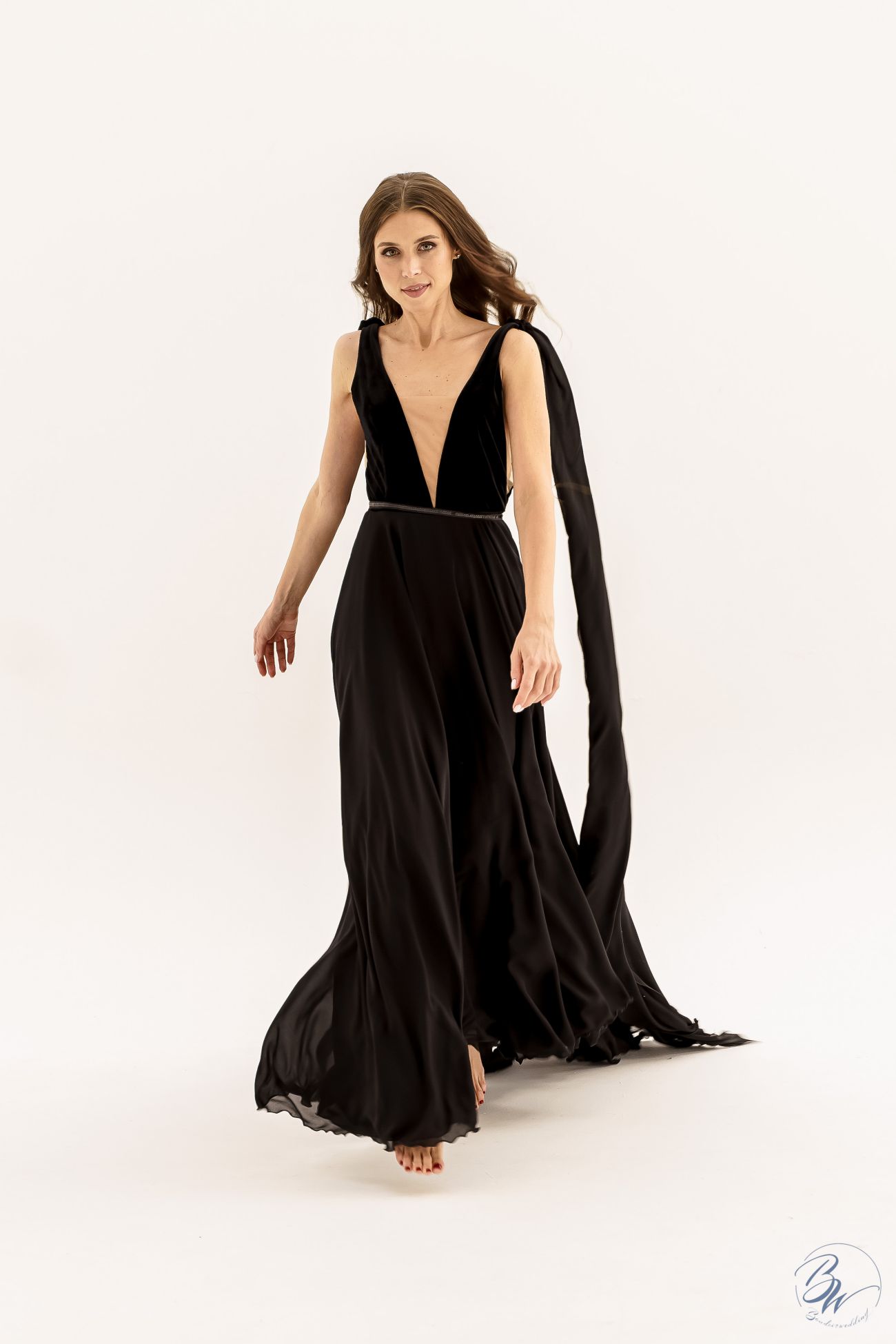 The Petunia black chiffon evening dress is a true masterpiece of elegance and mystery. It is designed for the bride or guest of the occasion to attract admiring looks with its sophistication and unique image.