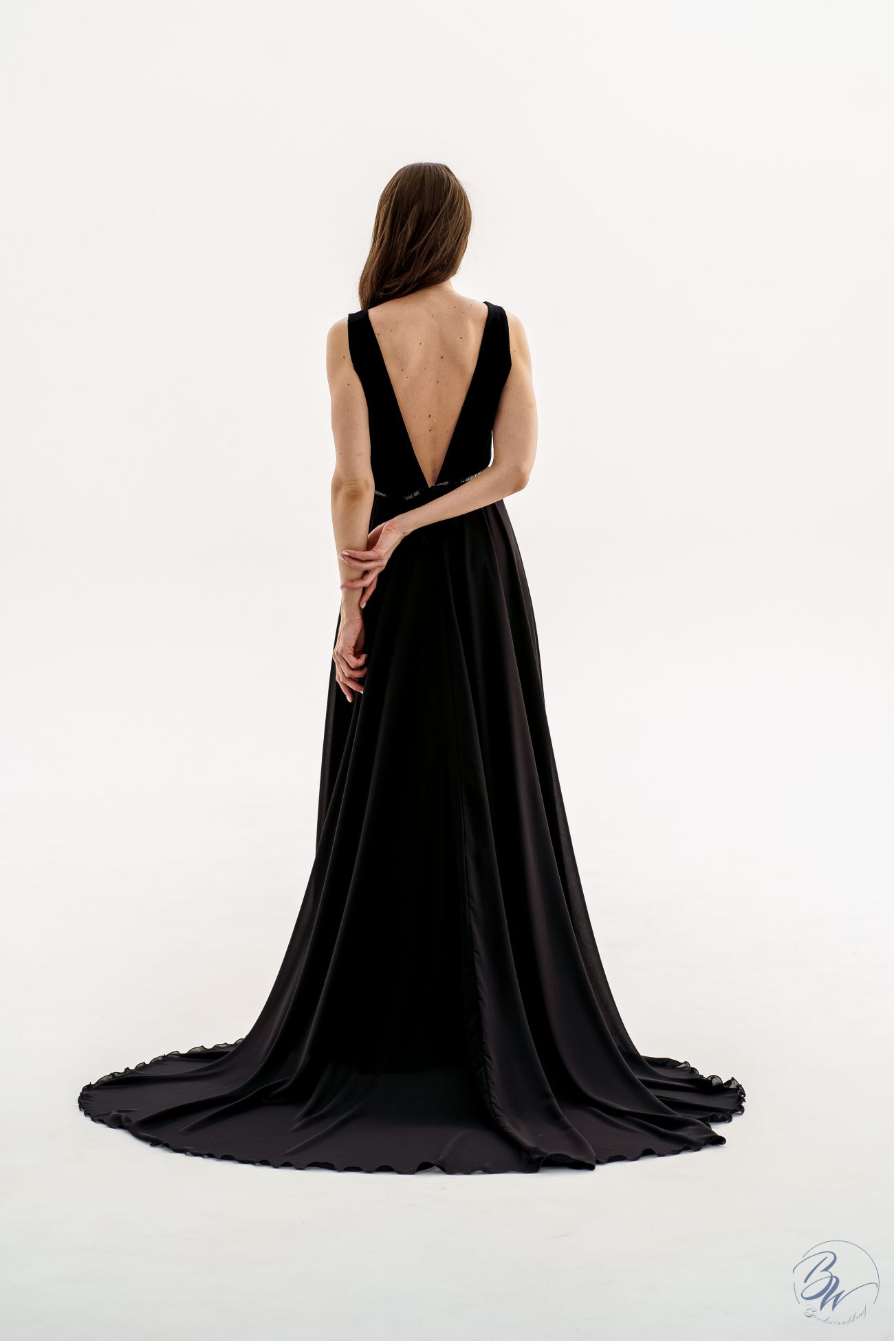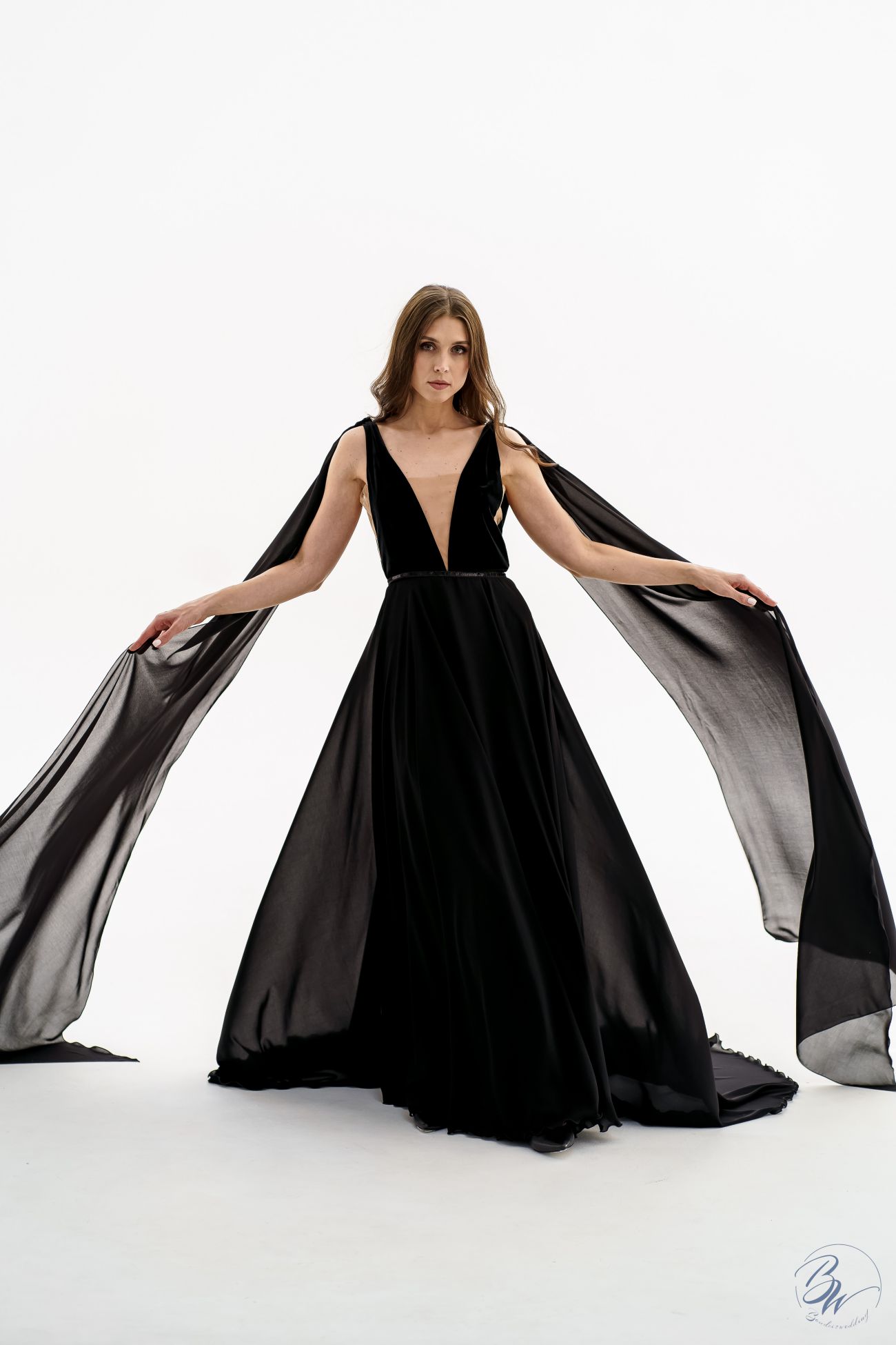 The black chiffon ribbons coming down from the shoulders create a unique effect reminiscent of the wings of a black angel. They give the dress a mysterious and special appeal, as if the bride or the guest of honor acquires some magical power.