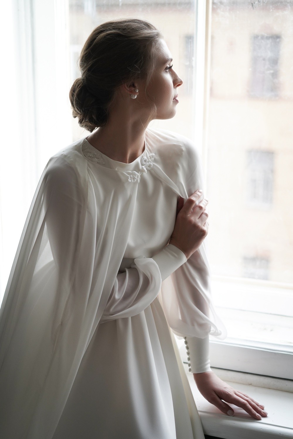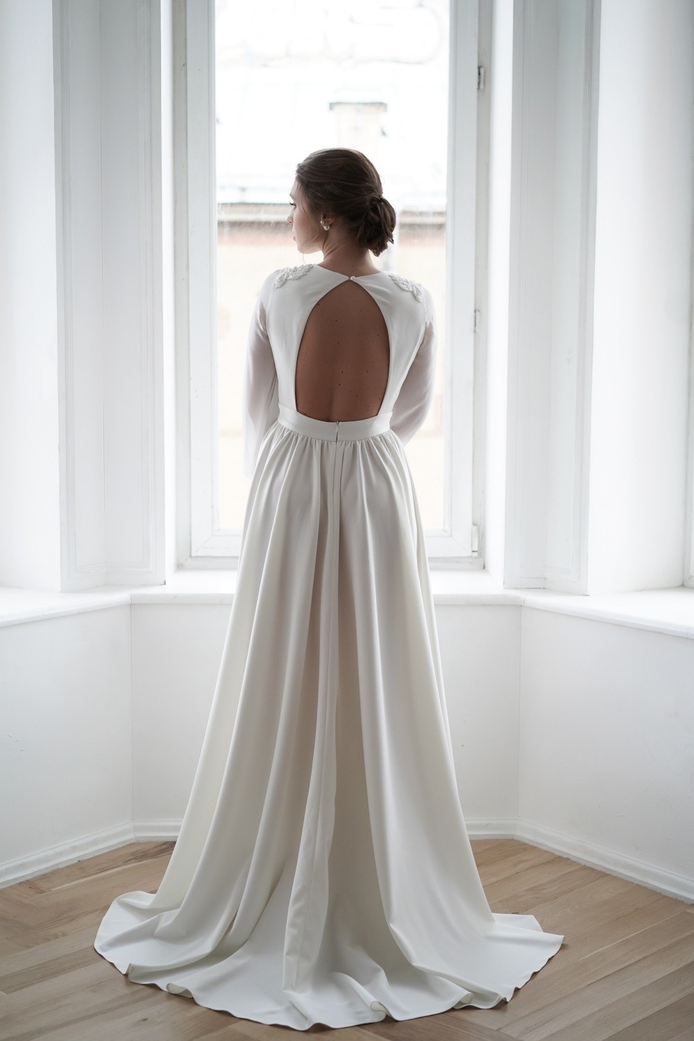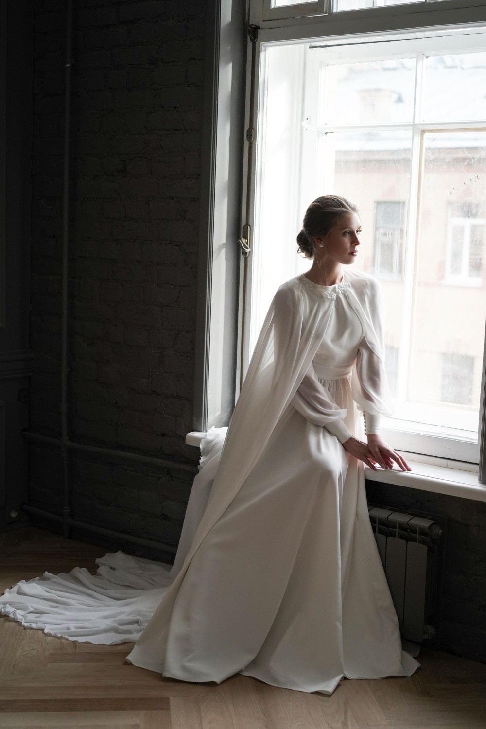 The delicate crepe wedding dress with a train, an unusual back and chiffon sleeves. The cape is not included in the price of the dress.