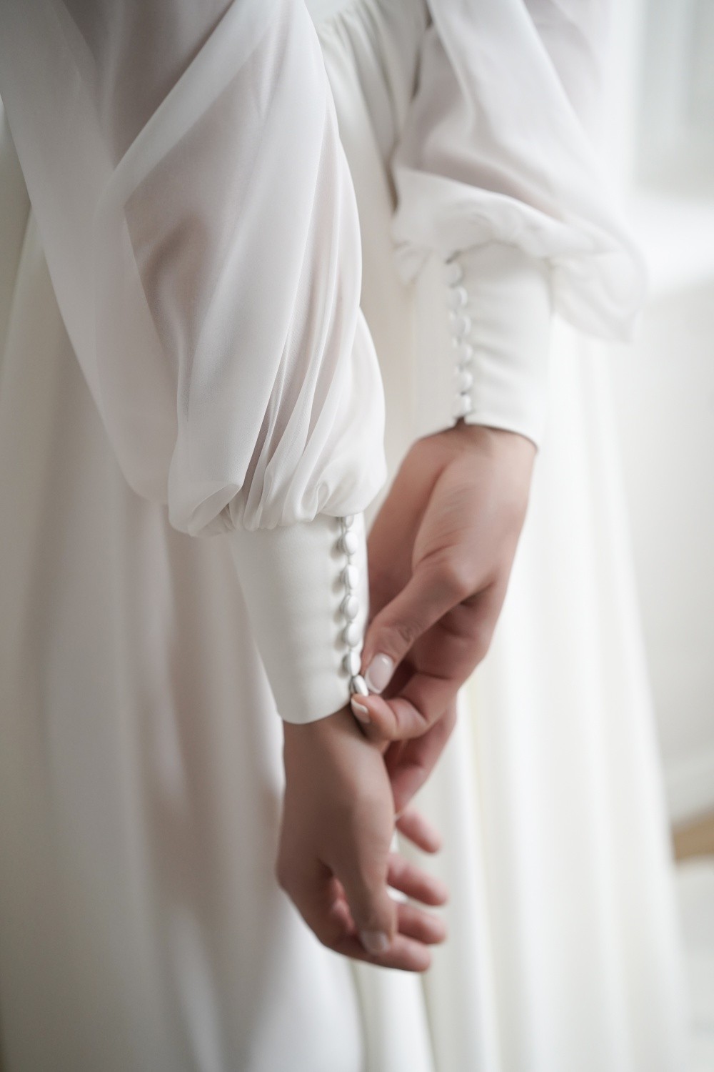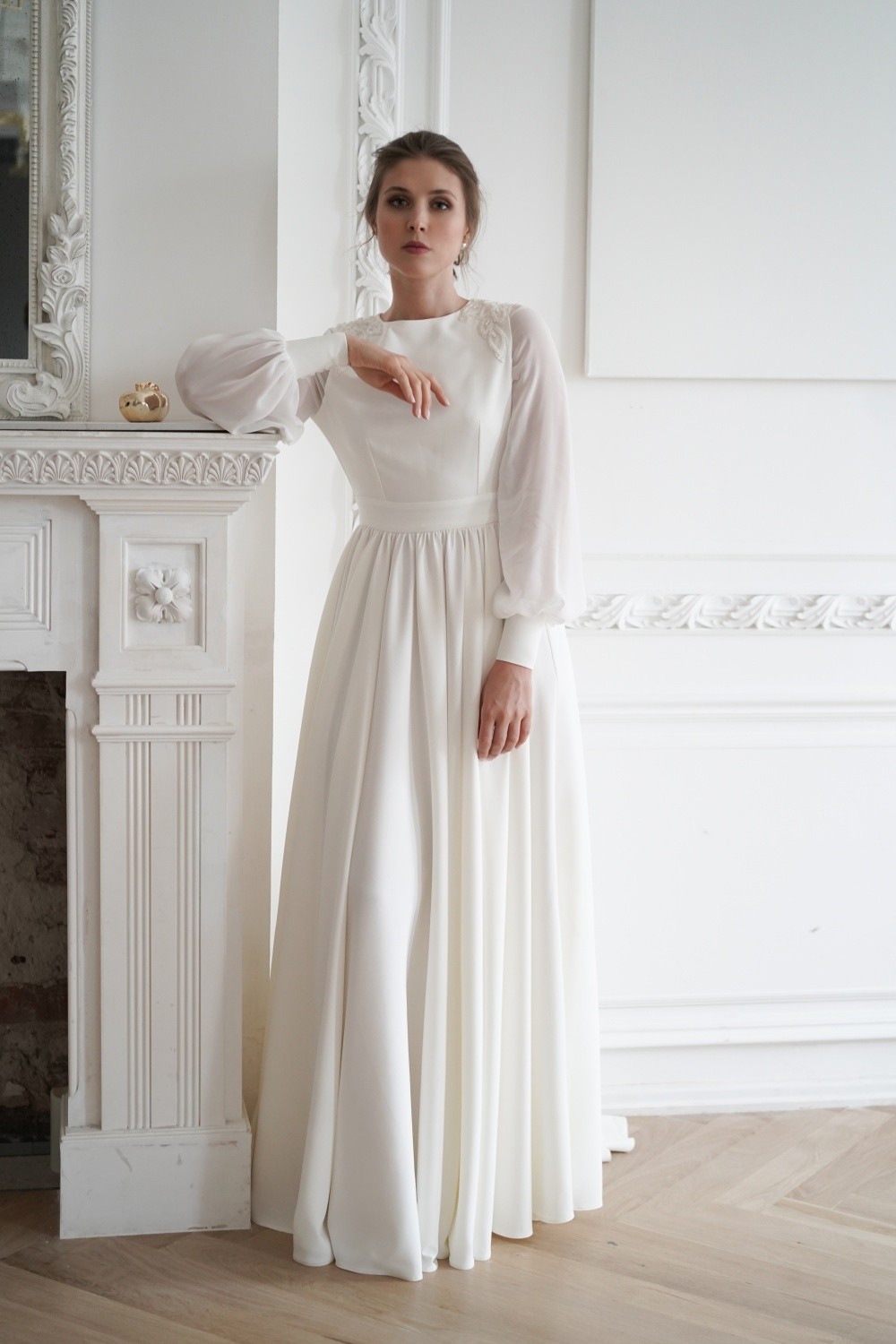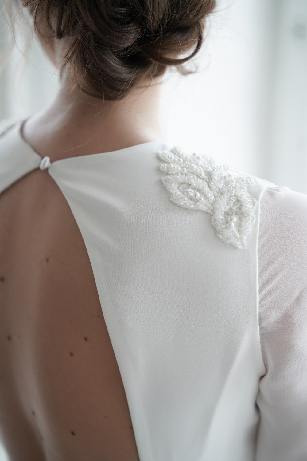 The delicate crepe wedding dress with a train, an unusual back and chiffon sleeves. The cape is not included in the price of the dress.