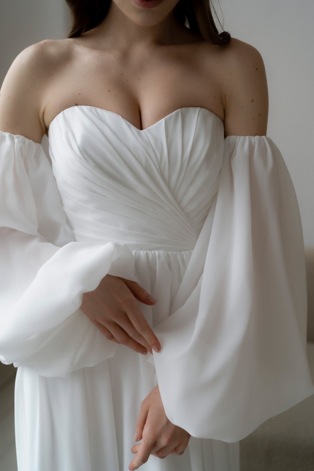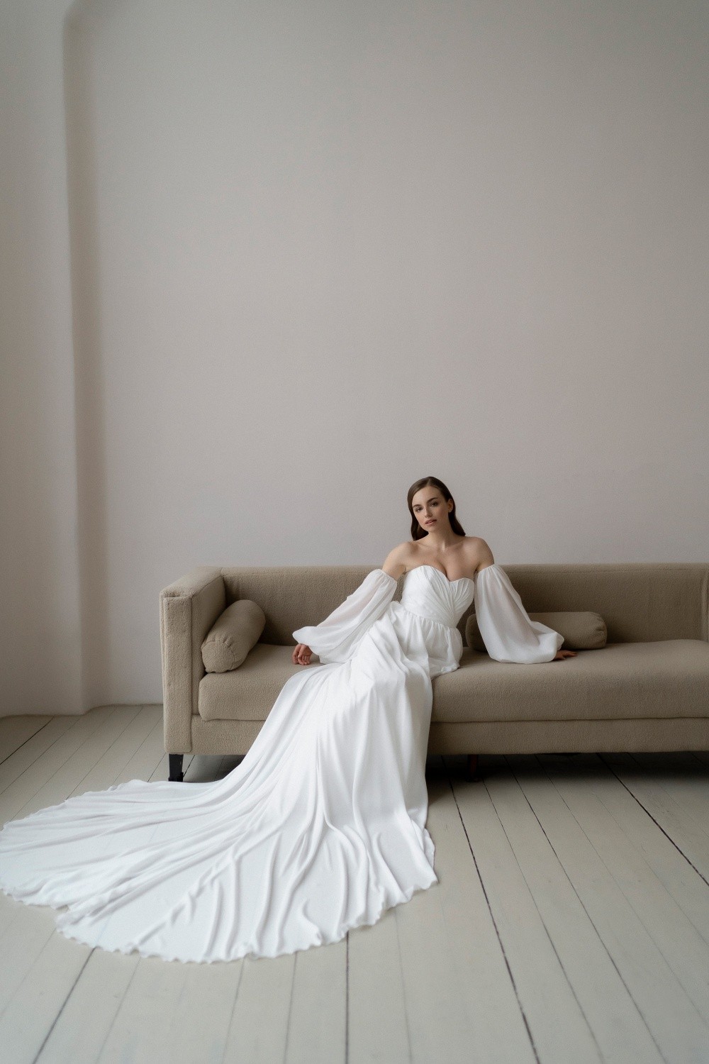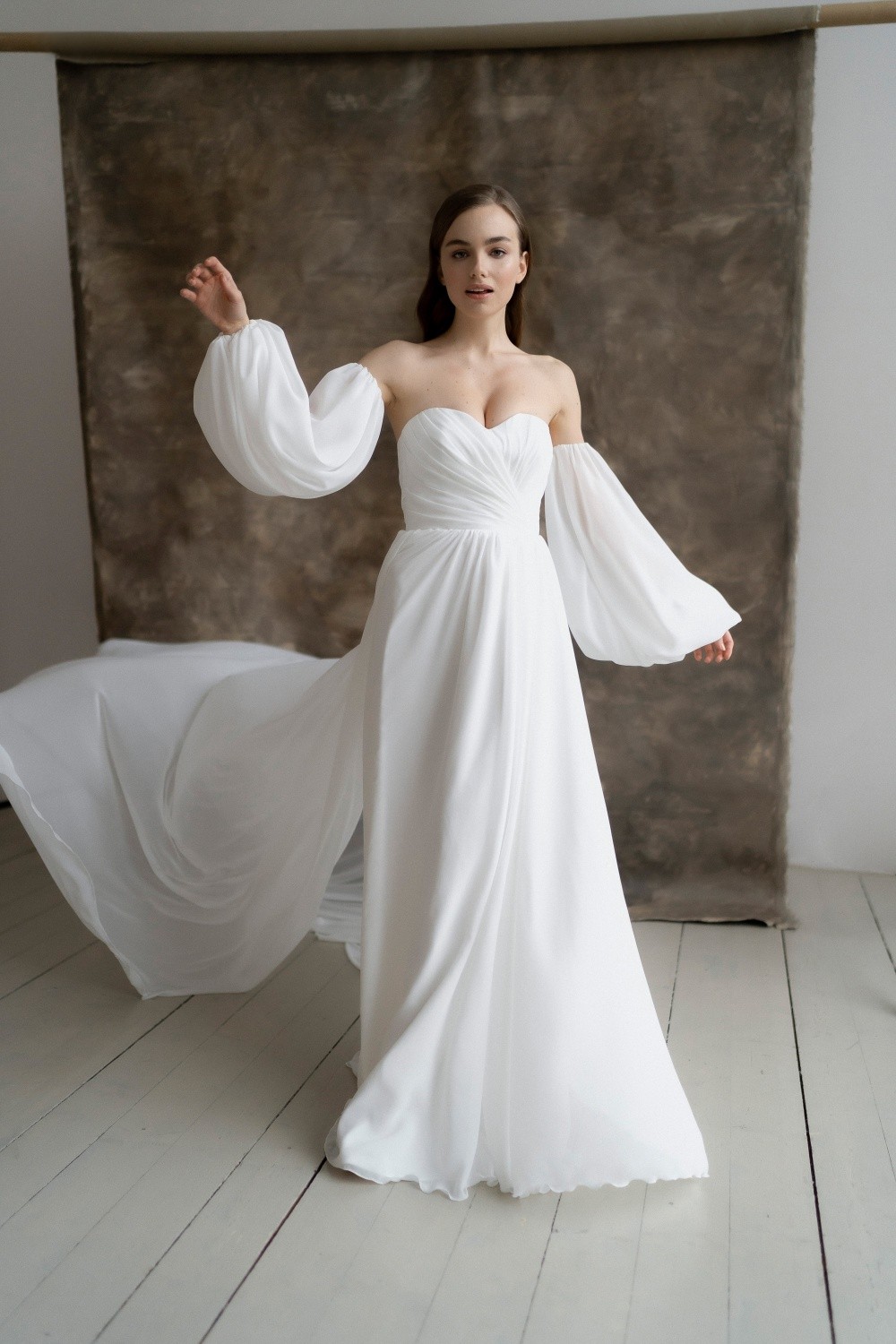 The wedding dress Andrea is made of chiffon and satin. The dress has removable sleeves and a beautiful long train.