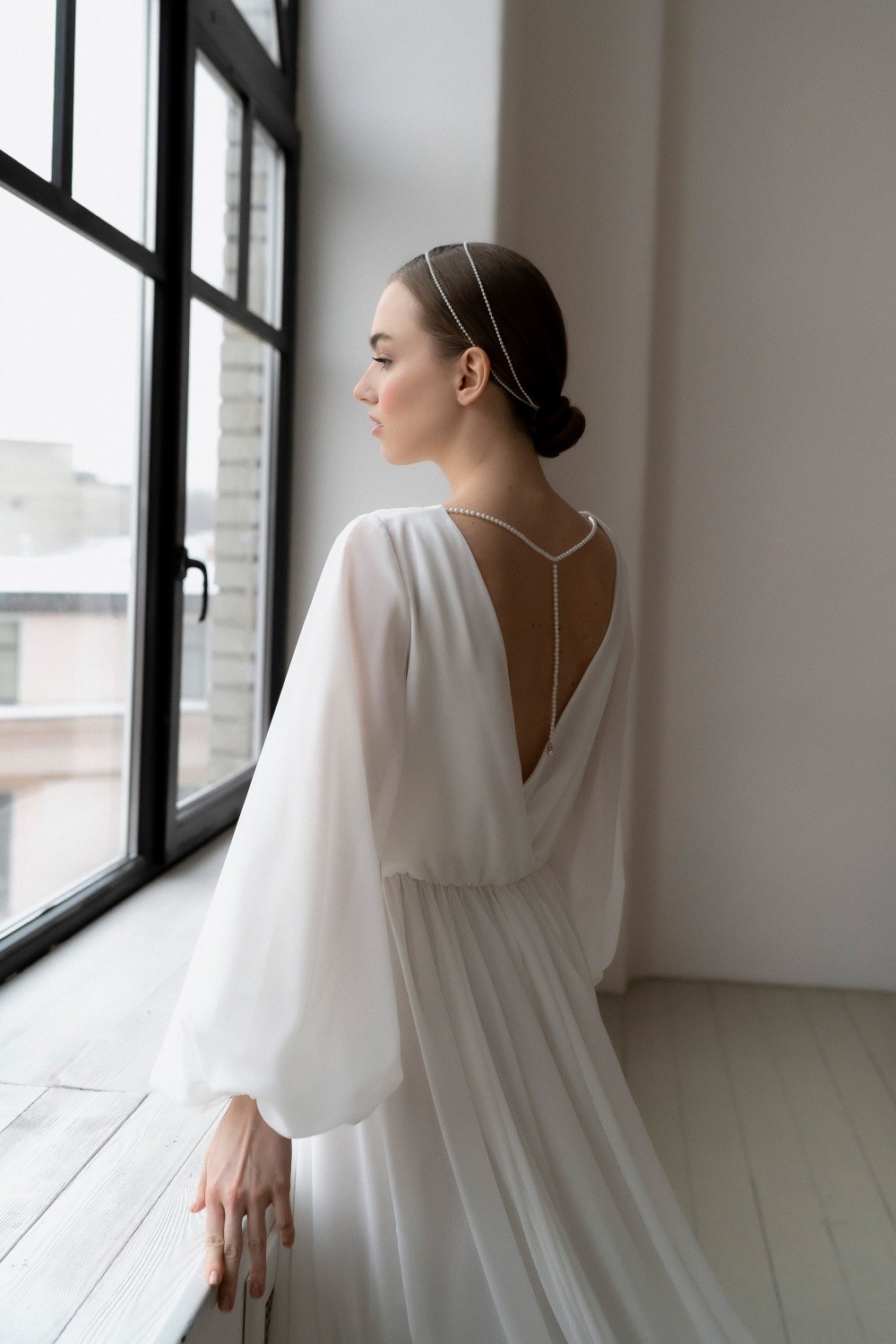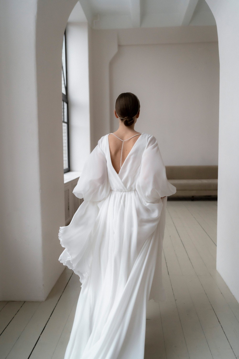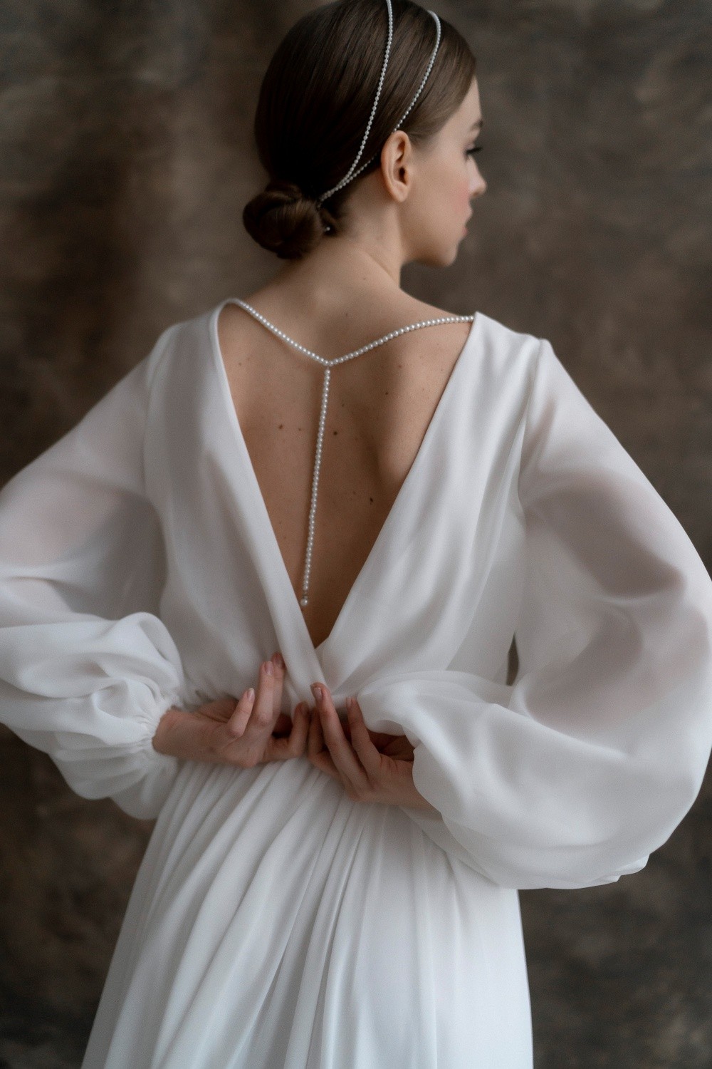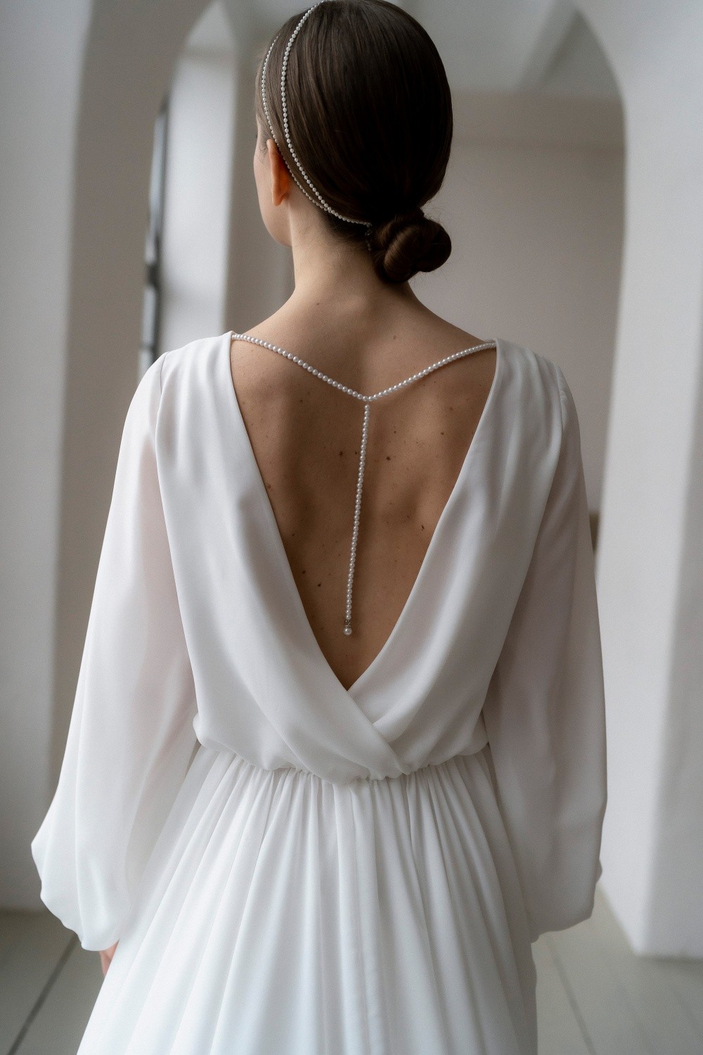 The Augusta wedding dress consists of 2 parts, an upper and a lower dress. The upper dress is made of chiffon and has a decorative element on the back. which can be completely unfastened. Also on the upper and lower dress there is a cut that effectively emphasizes the beauty of the bride’s legs.