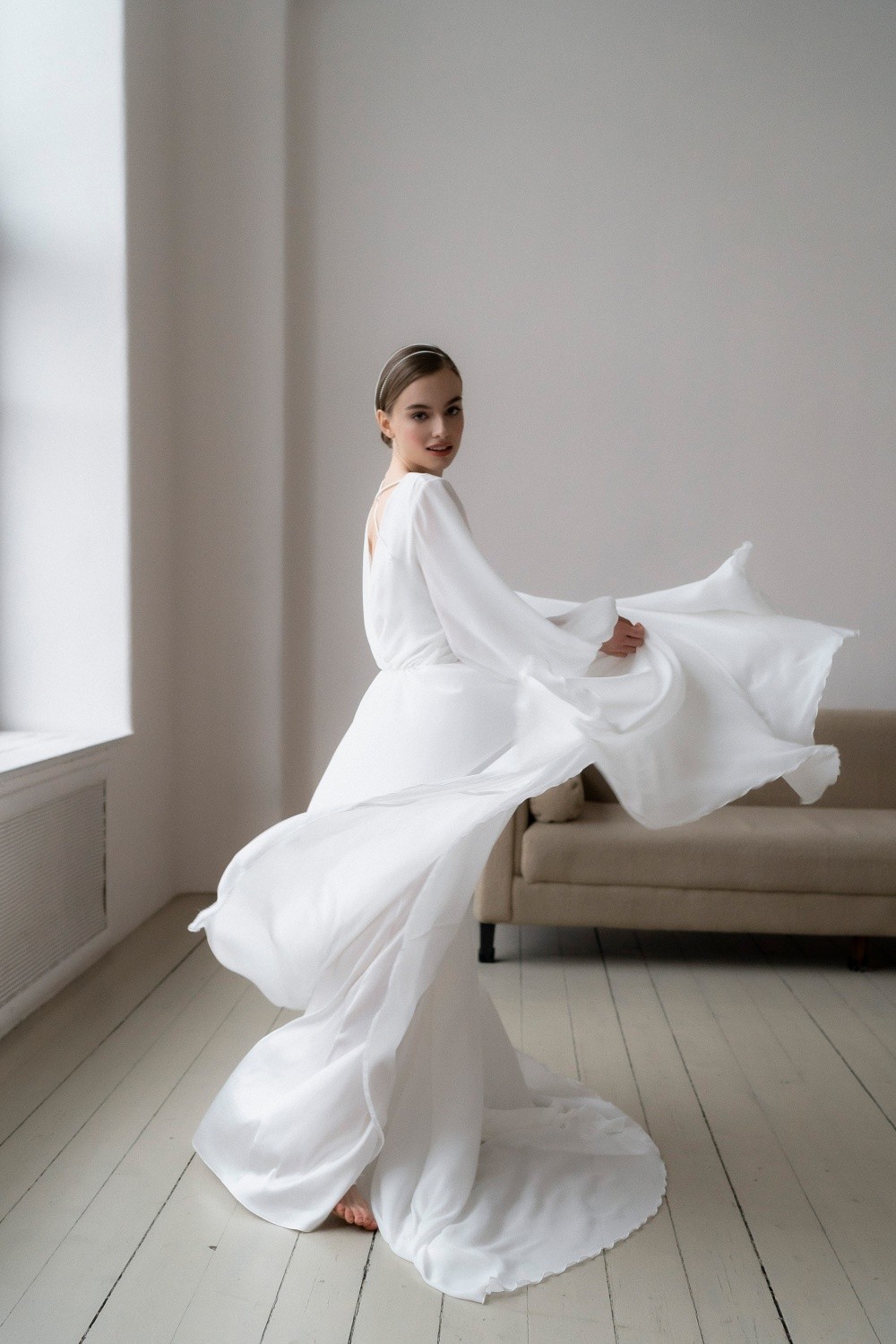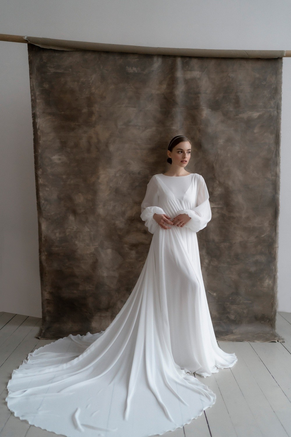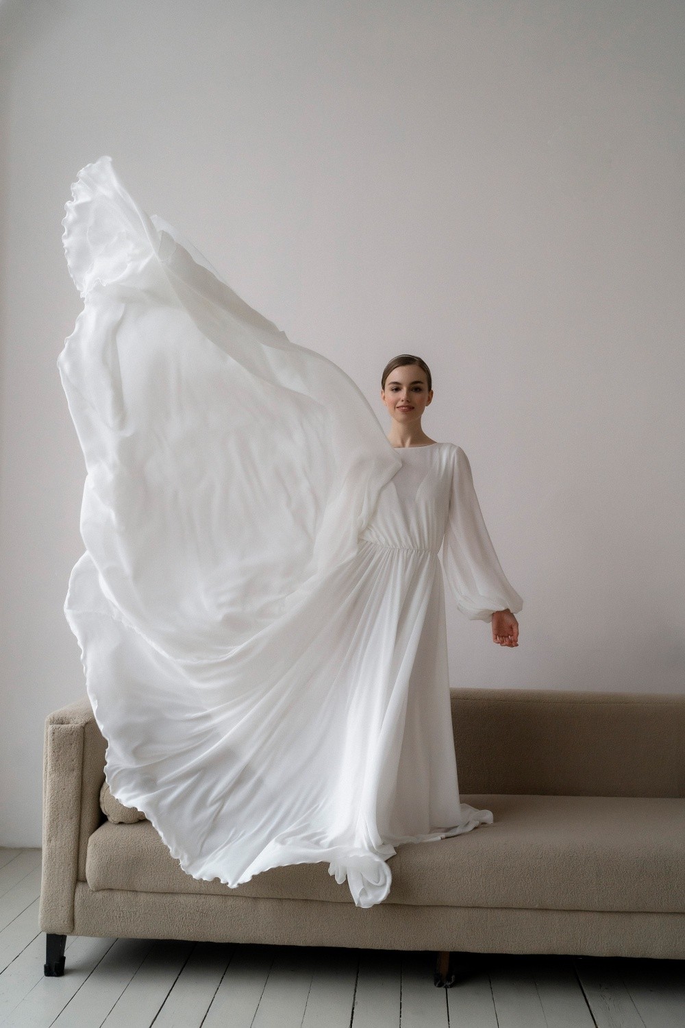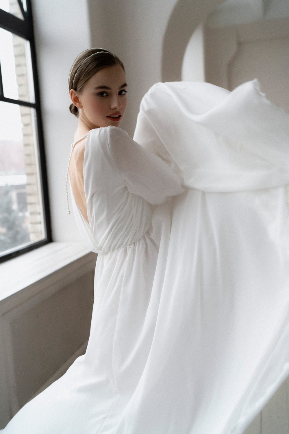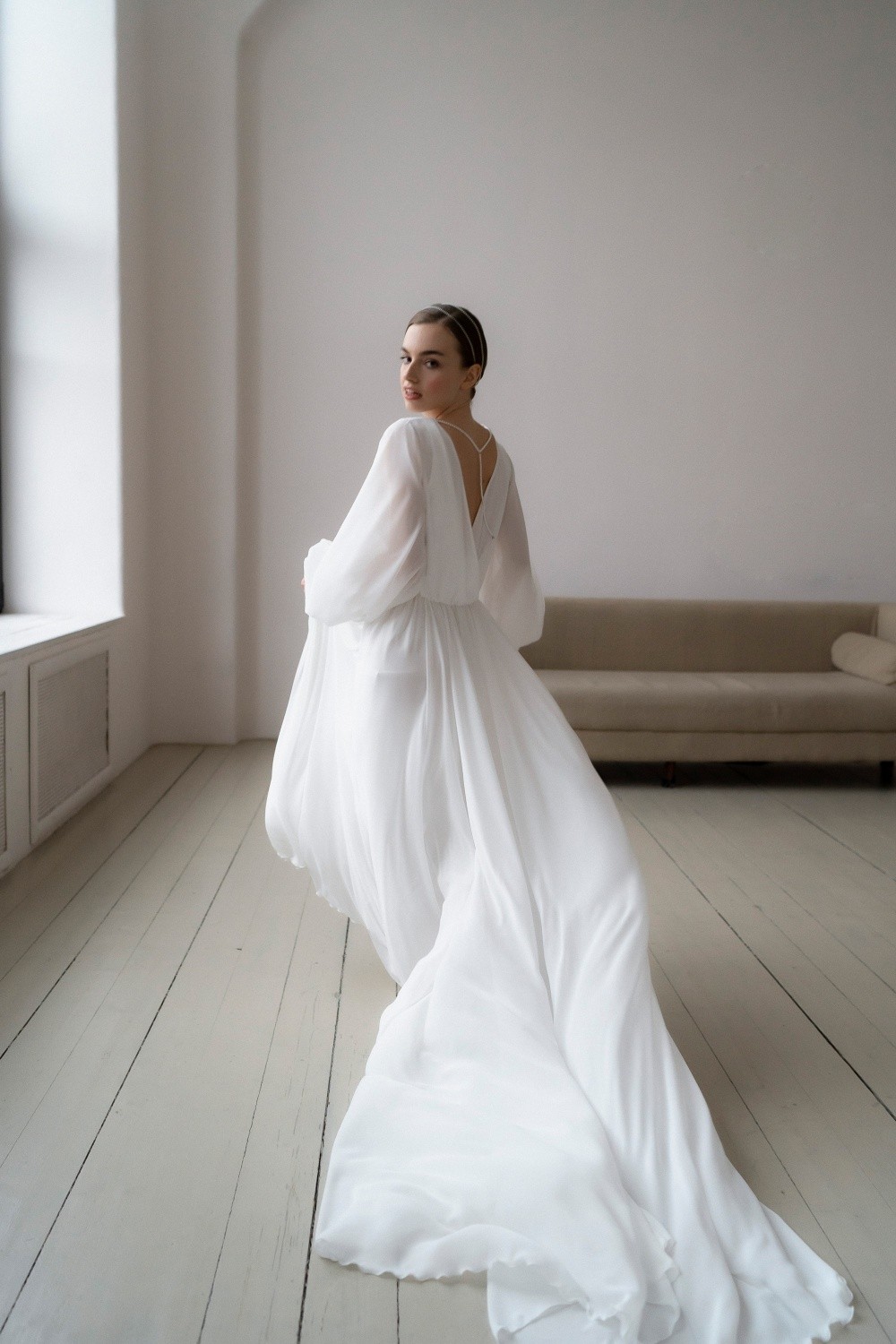 The Augusta wedding dress consists of 2 parts, an upper and a lower dress. The upper dress is made of chiffon and has a decorative element on the back. which can be completely unfastened. Also on the upper and lower dress there is a cut that effectively emphasizes the beauty of the bride’s legs.