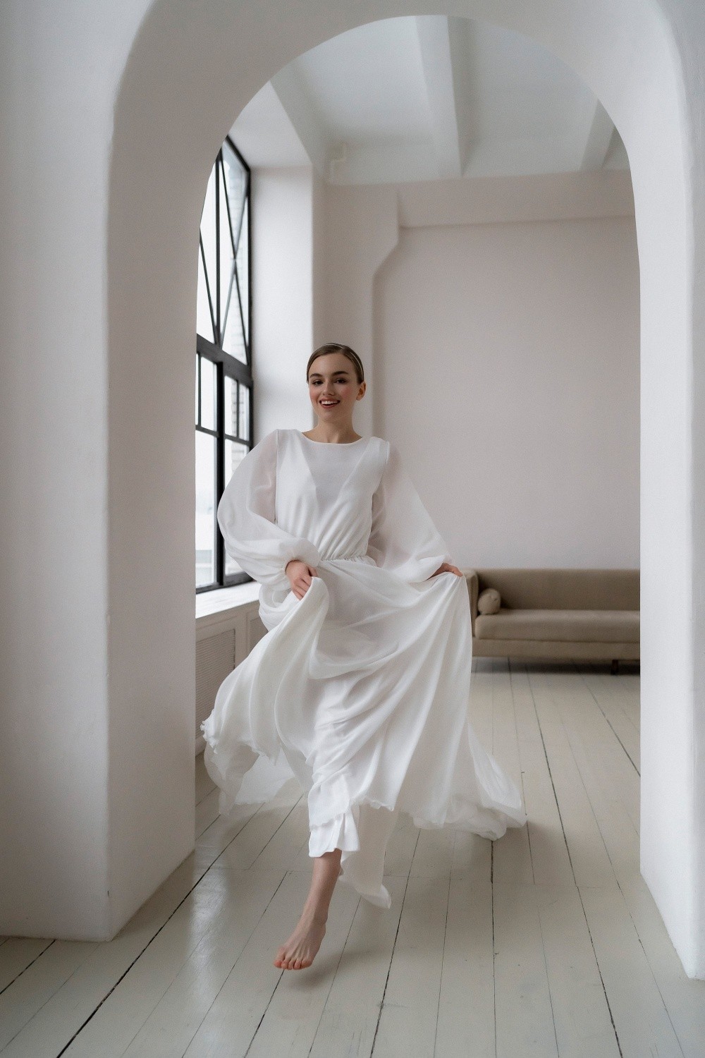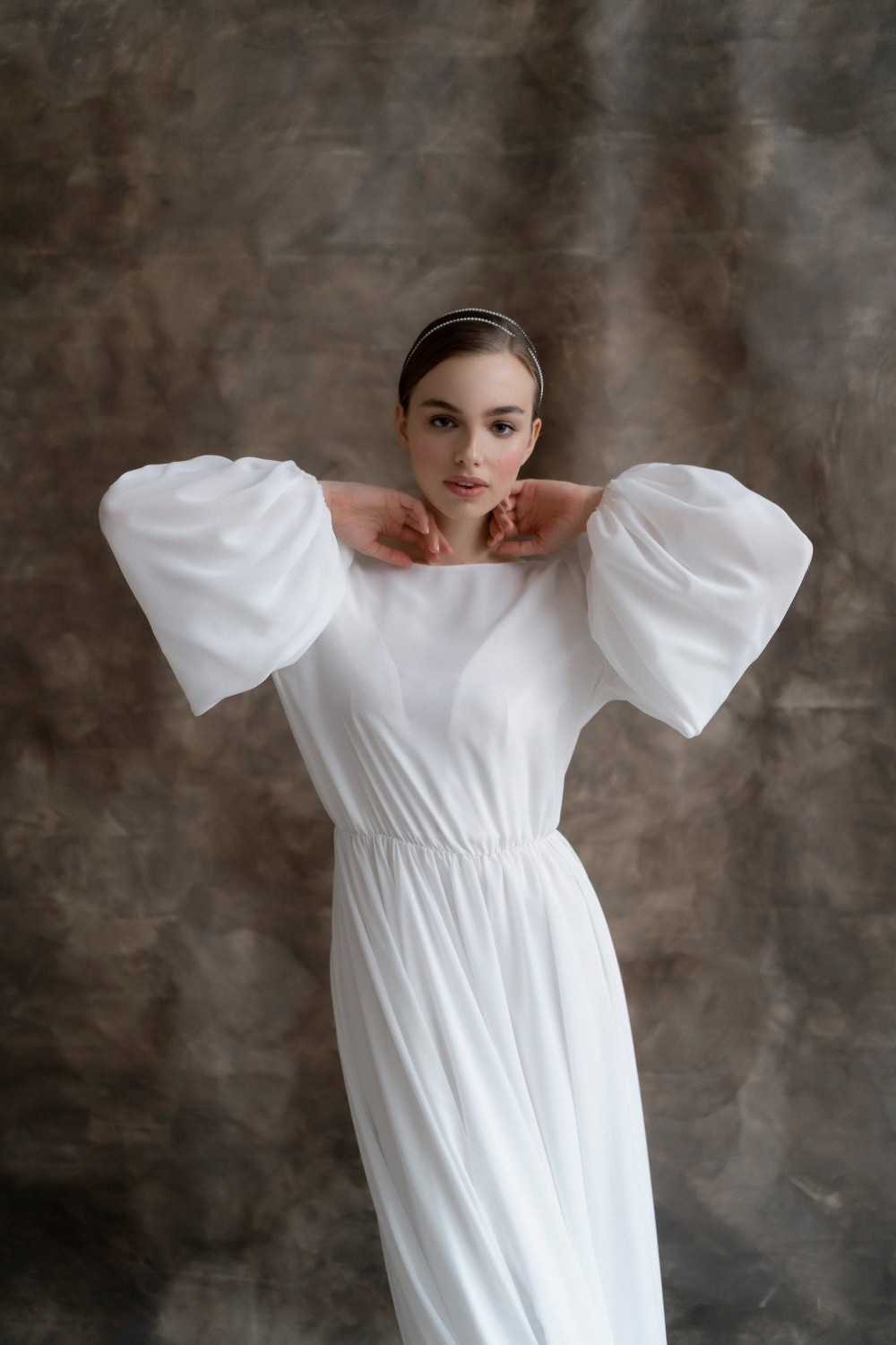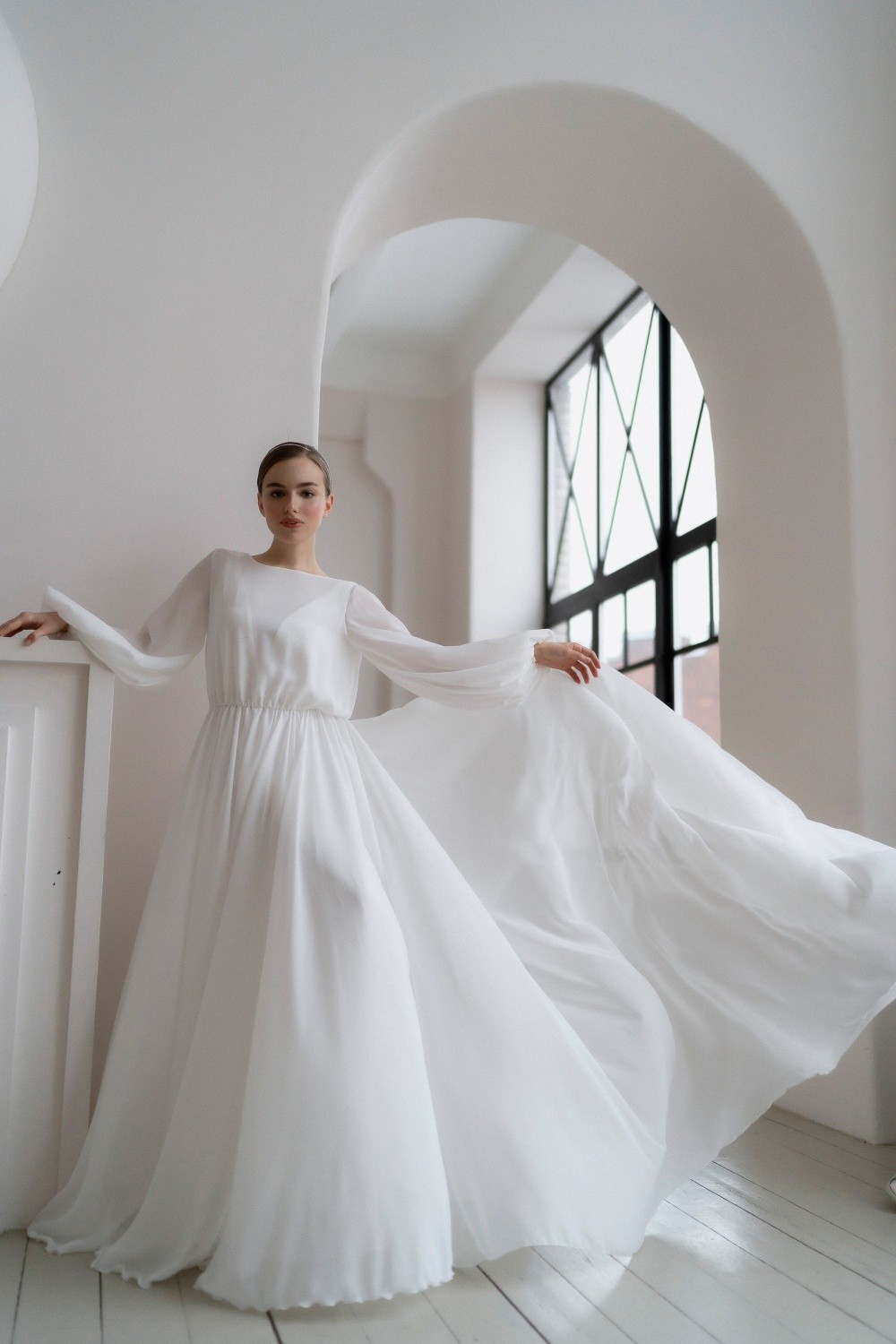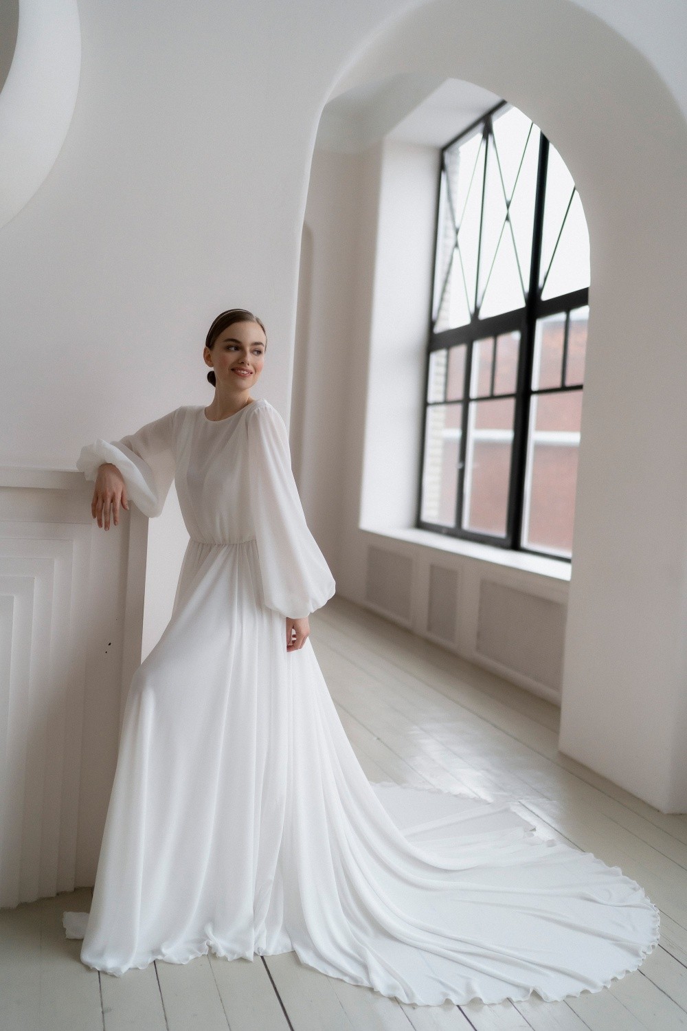 The Augusta wedding dress consists of 2 parts, an upper and a lower dress. The upper dress is made of chiffon and has a decorative element on the back. which can be completely unfastened. Also on the upper and lower dress there is a cut that effectively emphasizes the beauty of the bride’s legs.