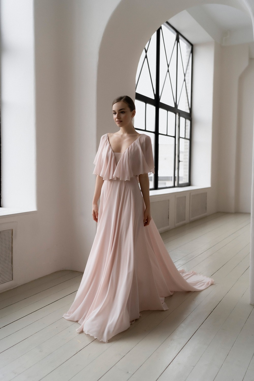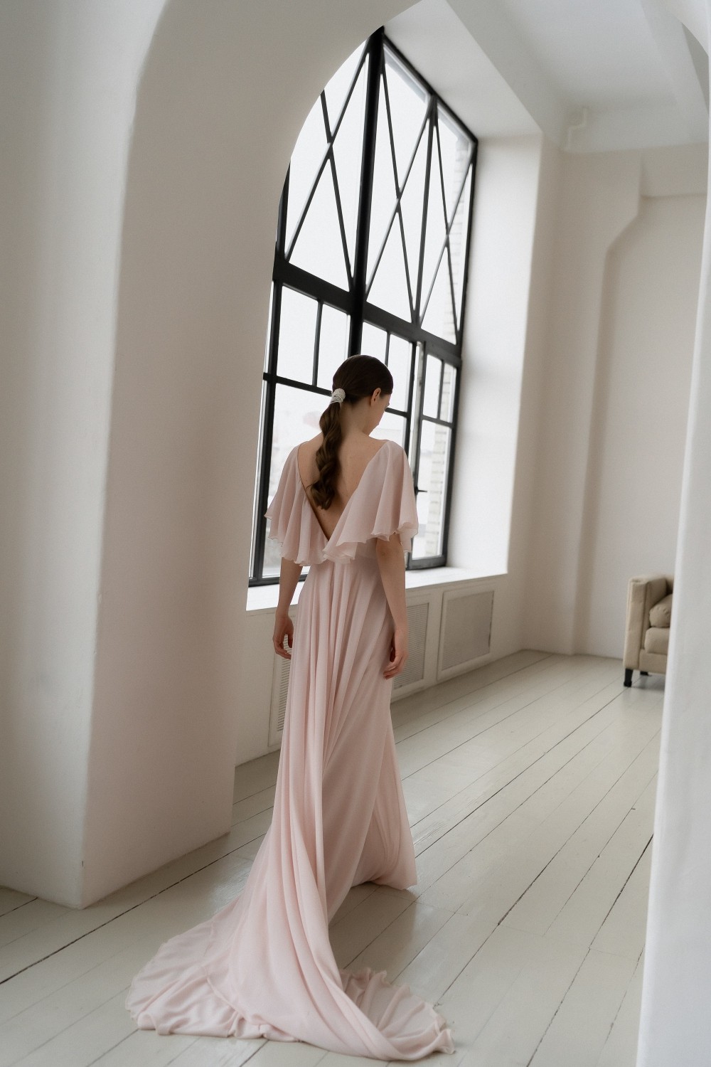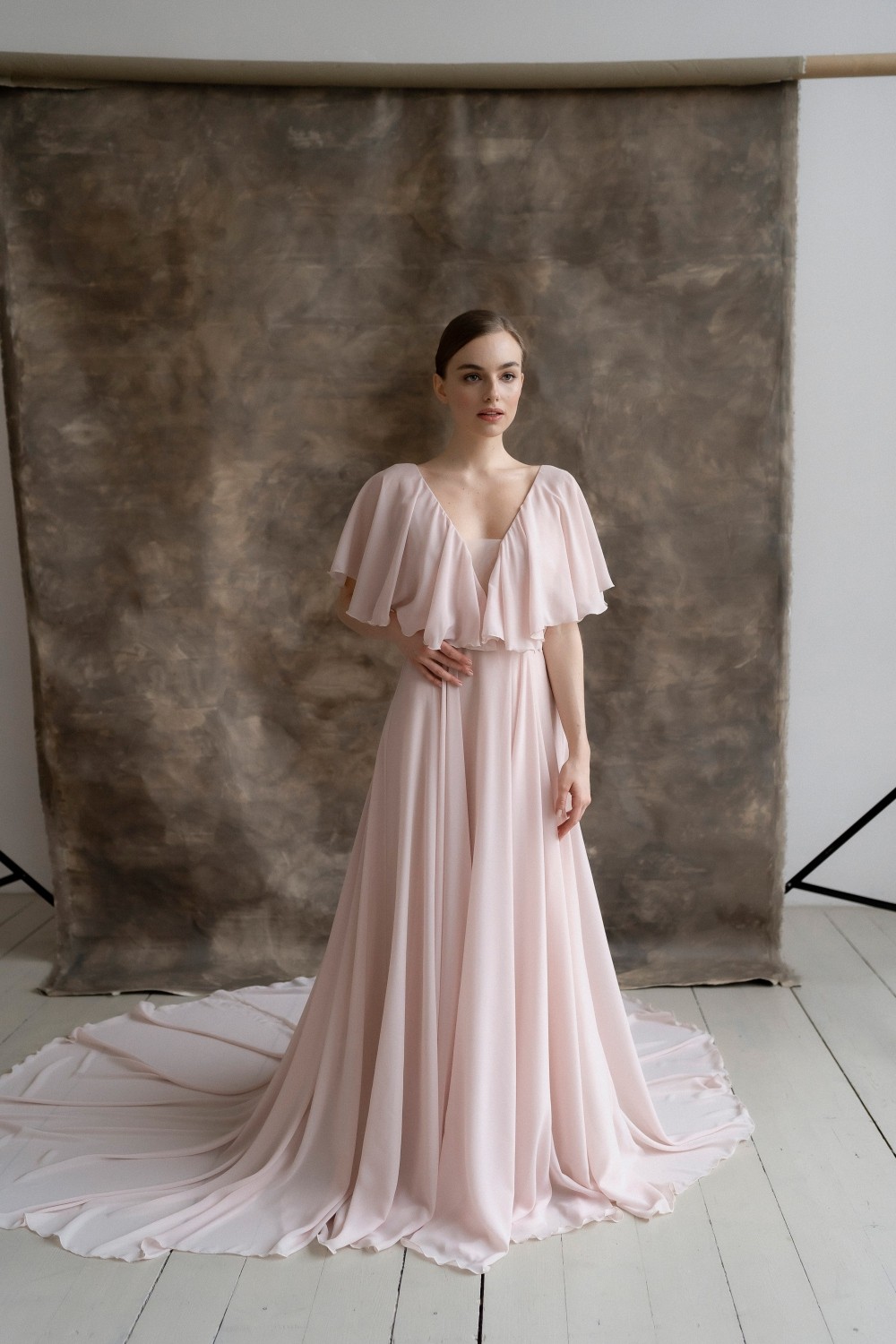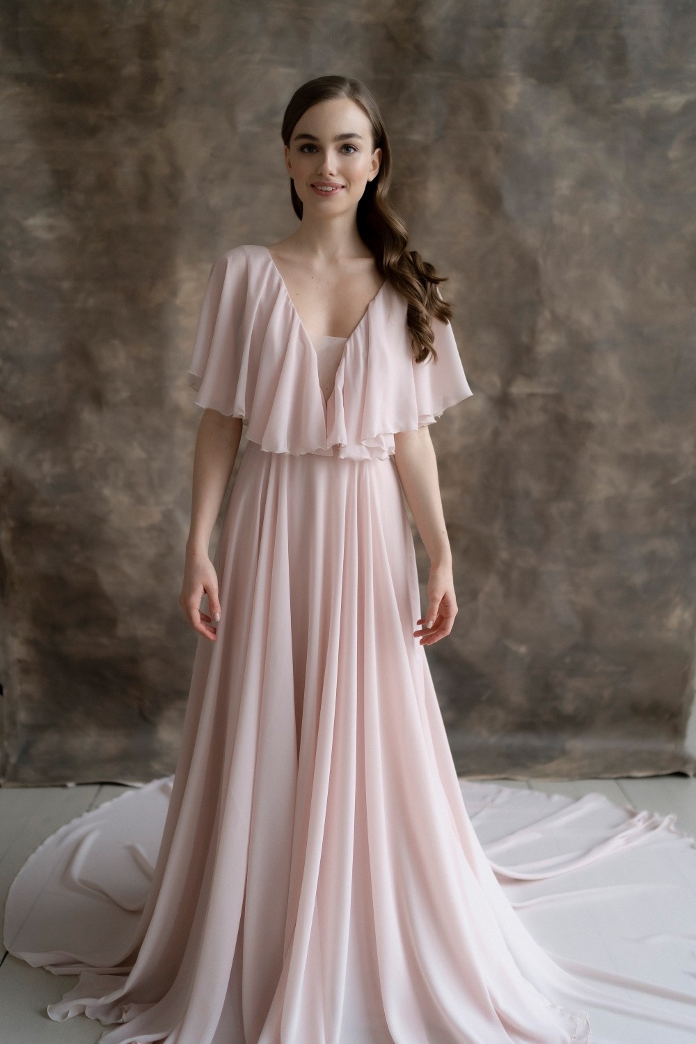 The wedding dress Berta is made of chiffon in powdery pink color.