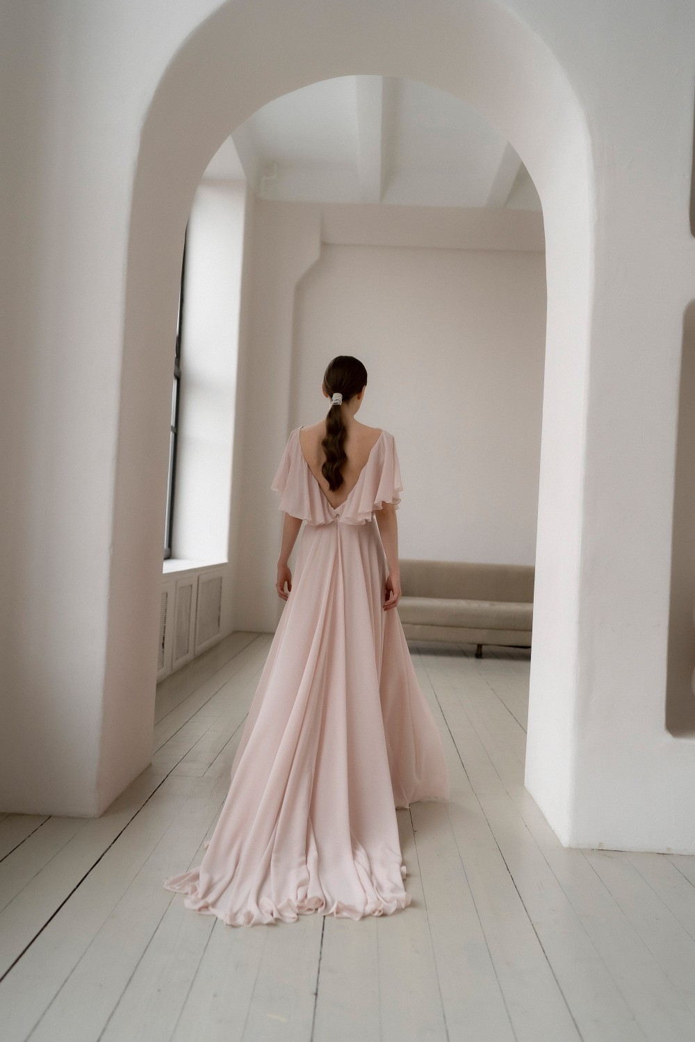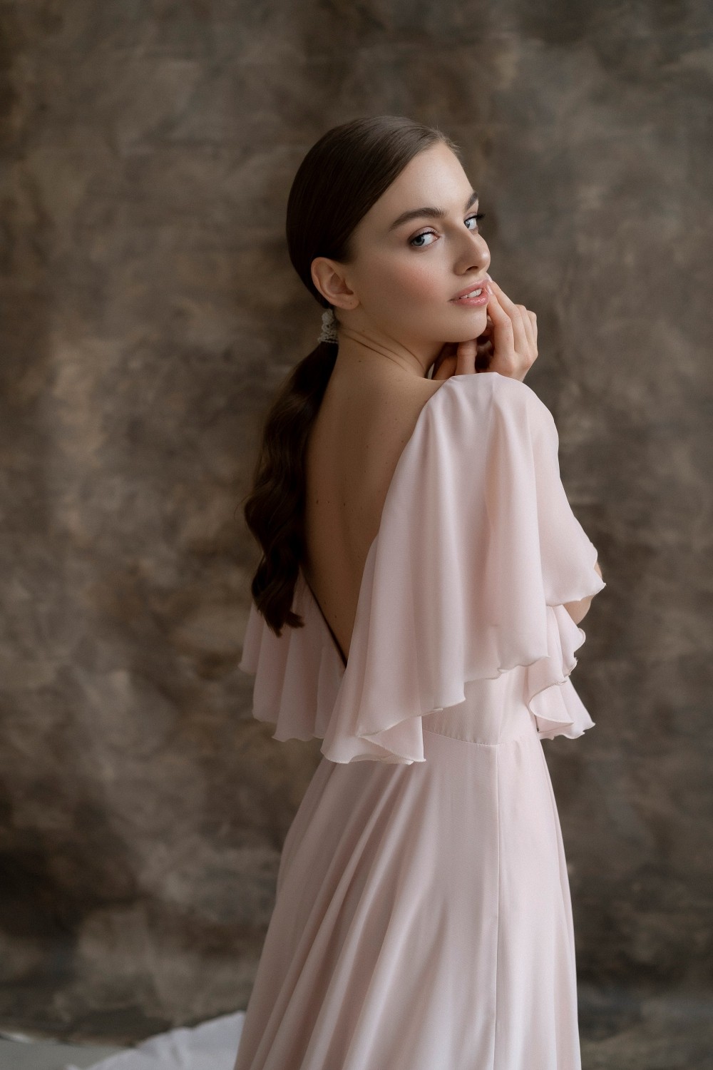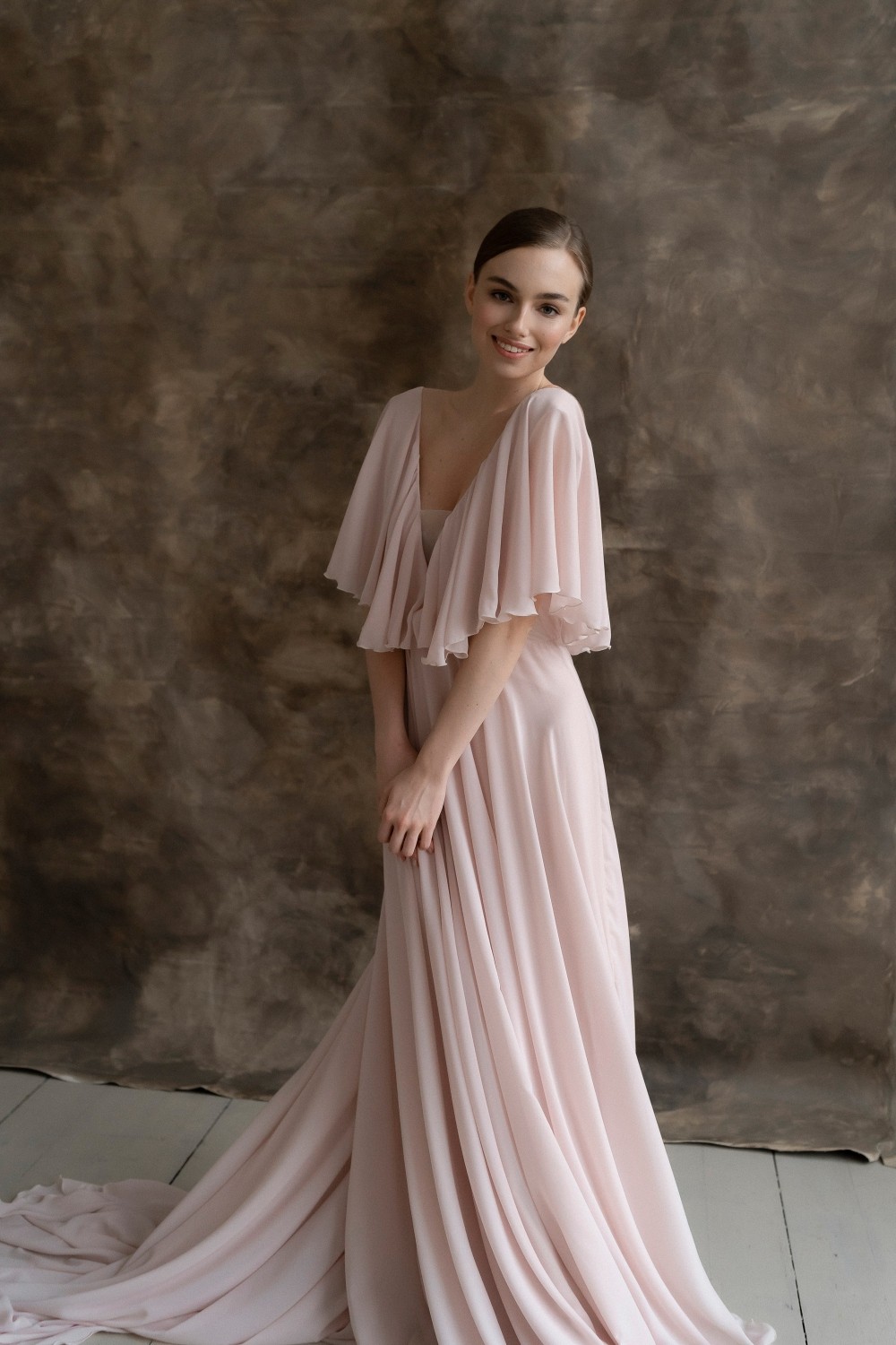 The wedding dress Berta is made of chiffon in powdery pink color.