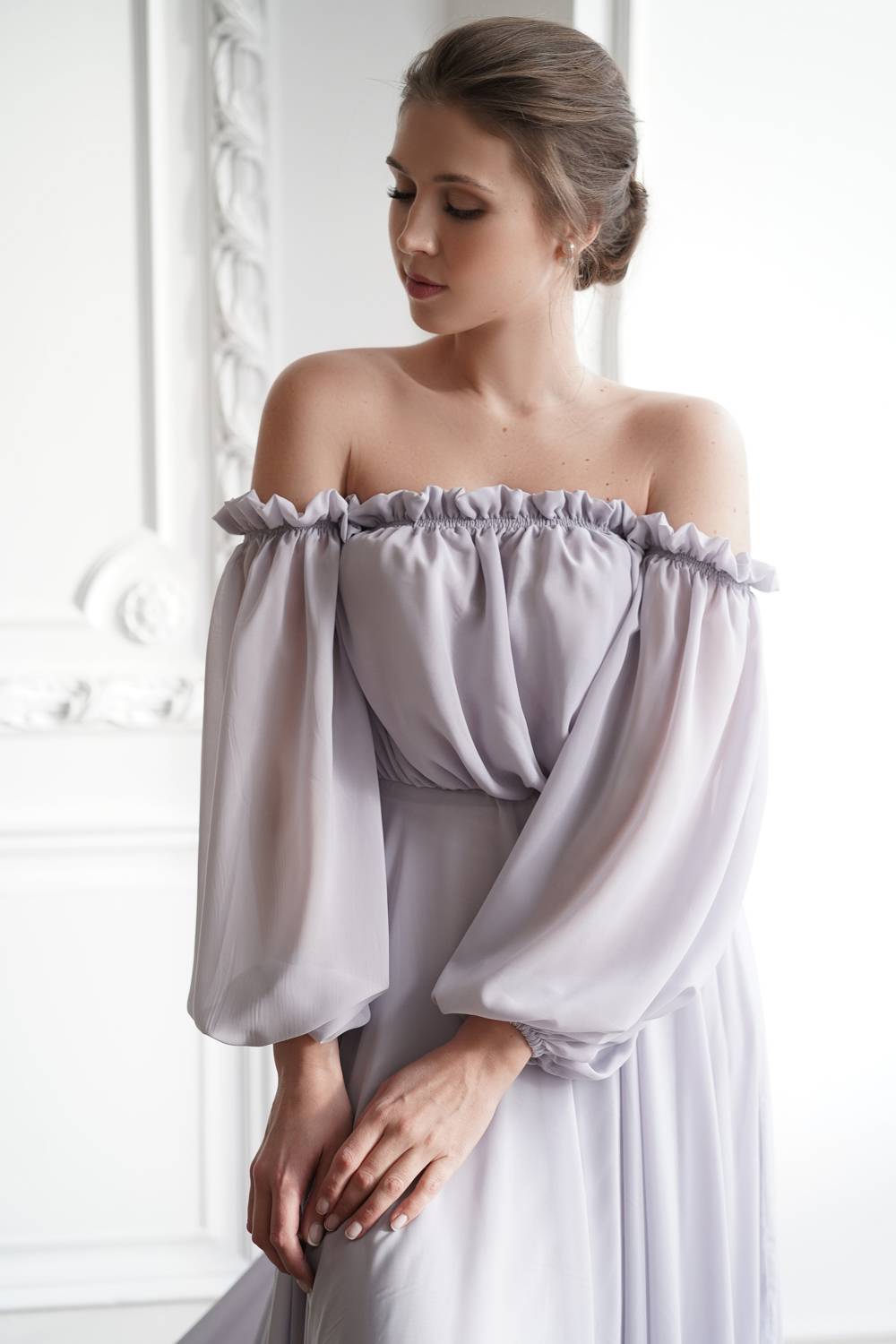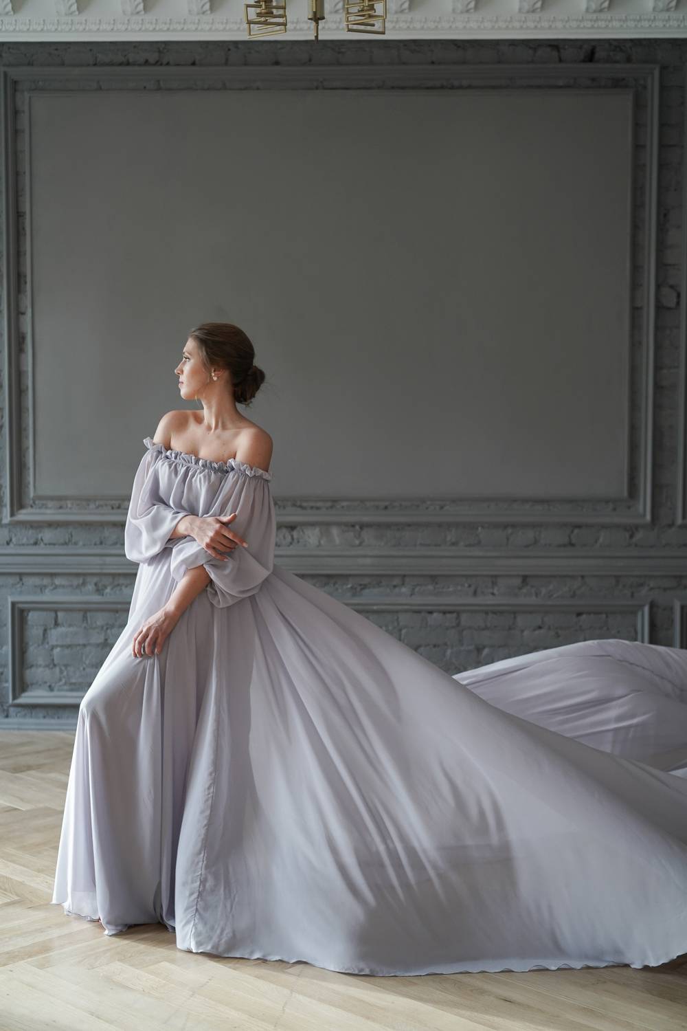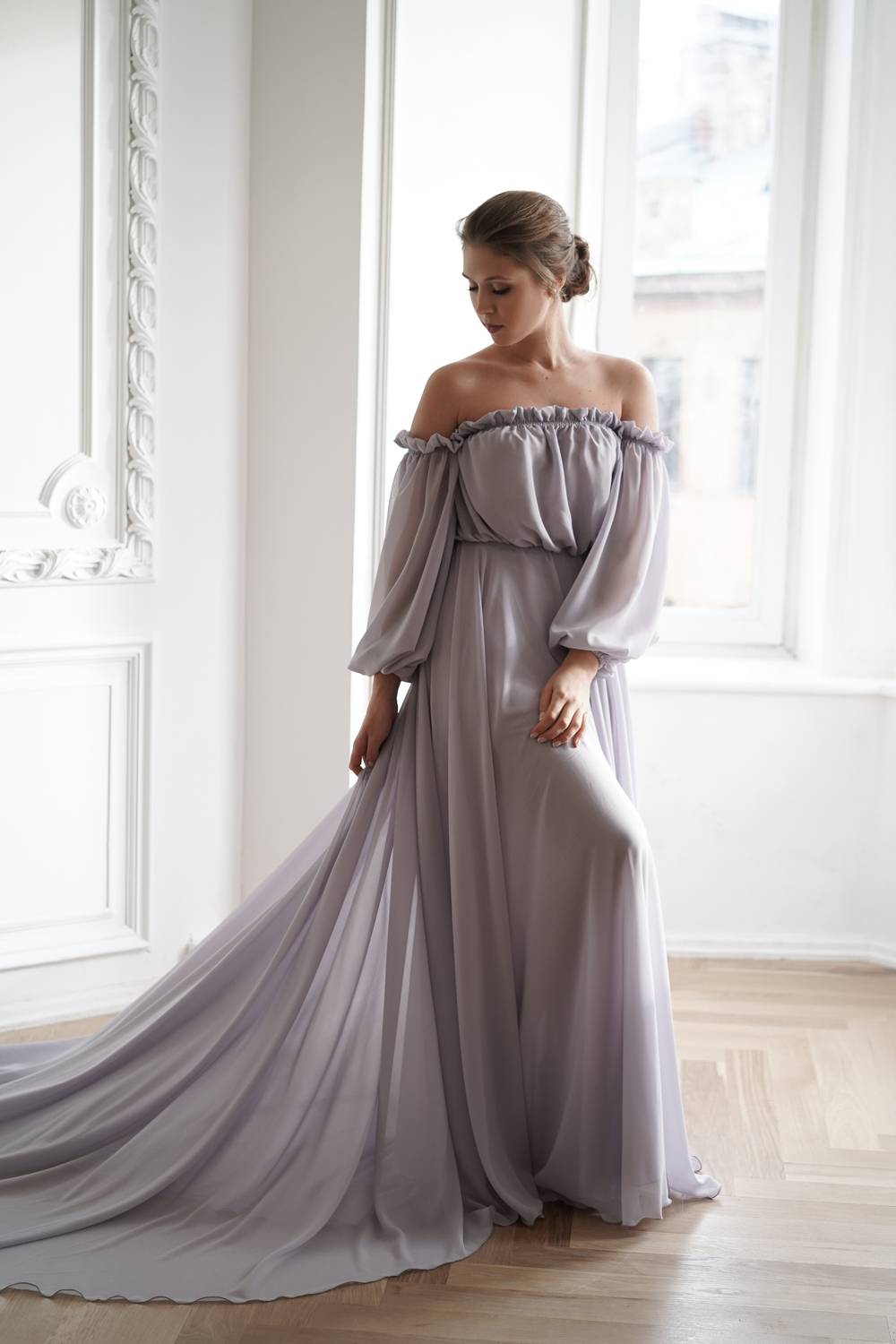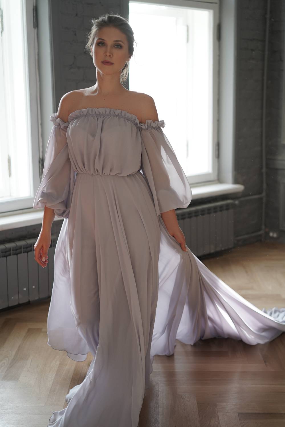 This dress has open shoulders and a long lantern sleeve that falls down, adding grace. The flowing hemline and long train give the dress an incredibly light and chic feel.