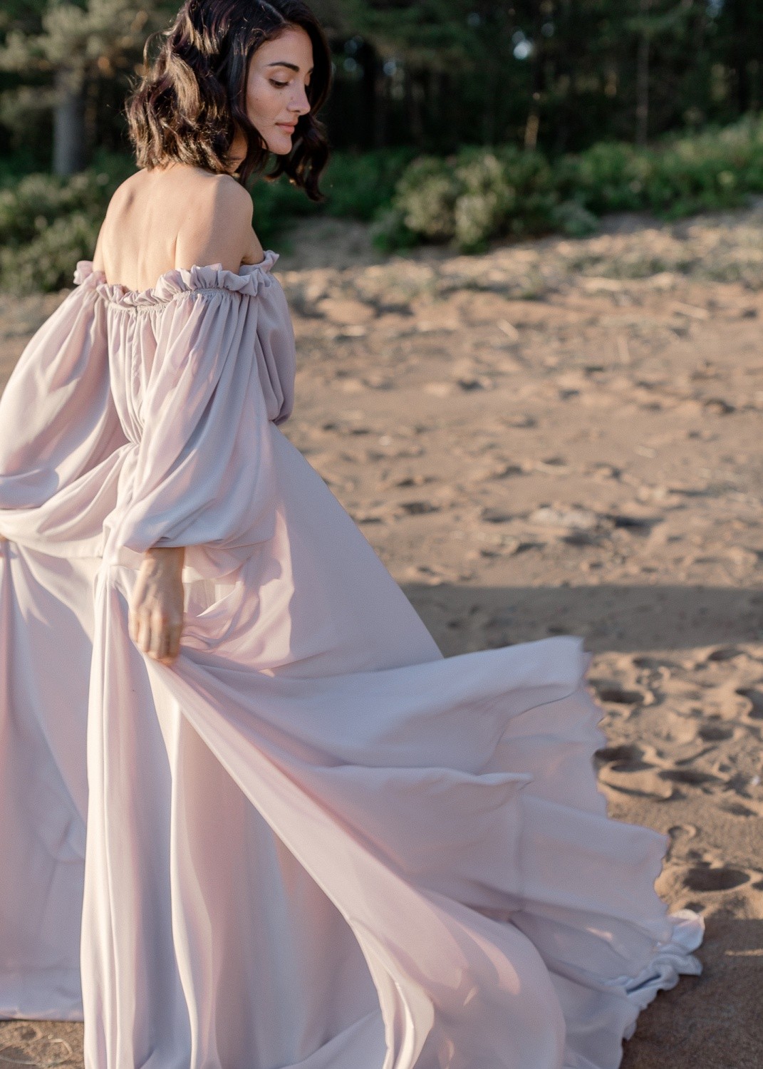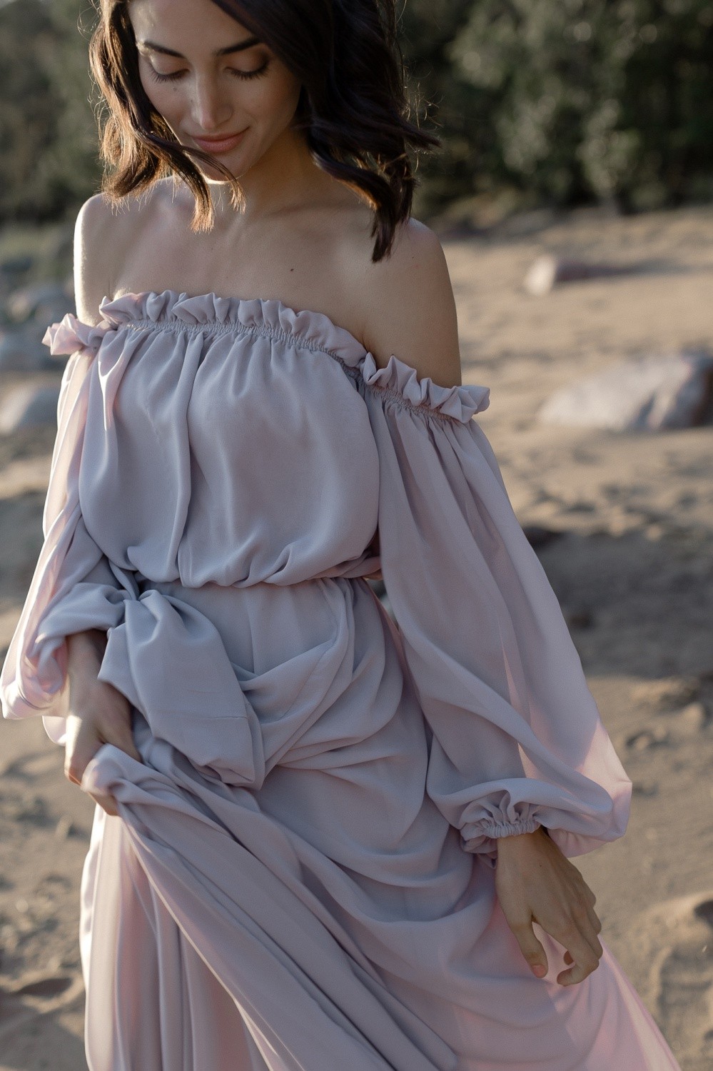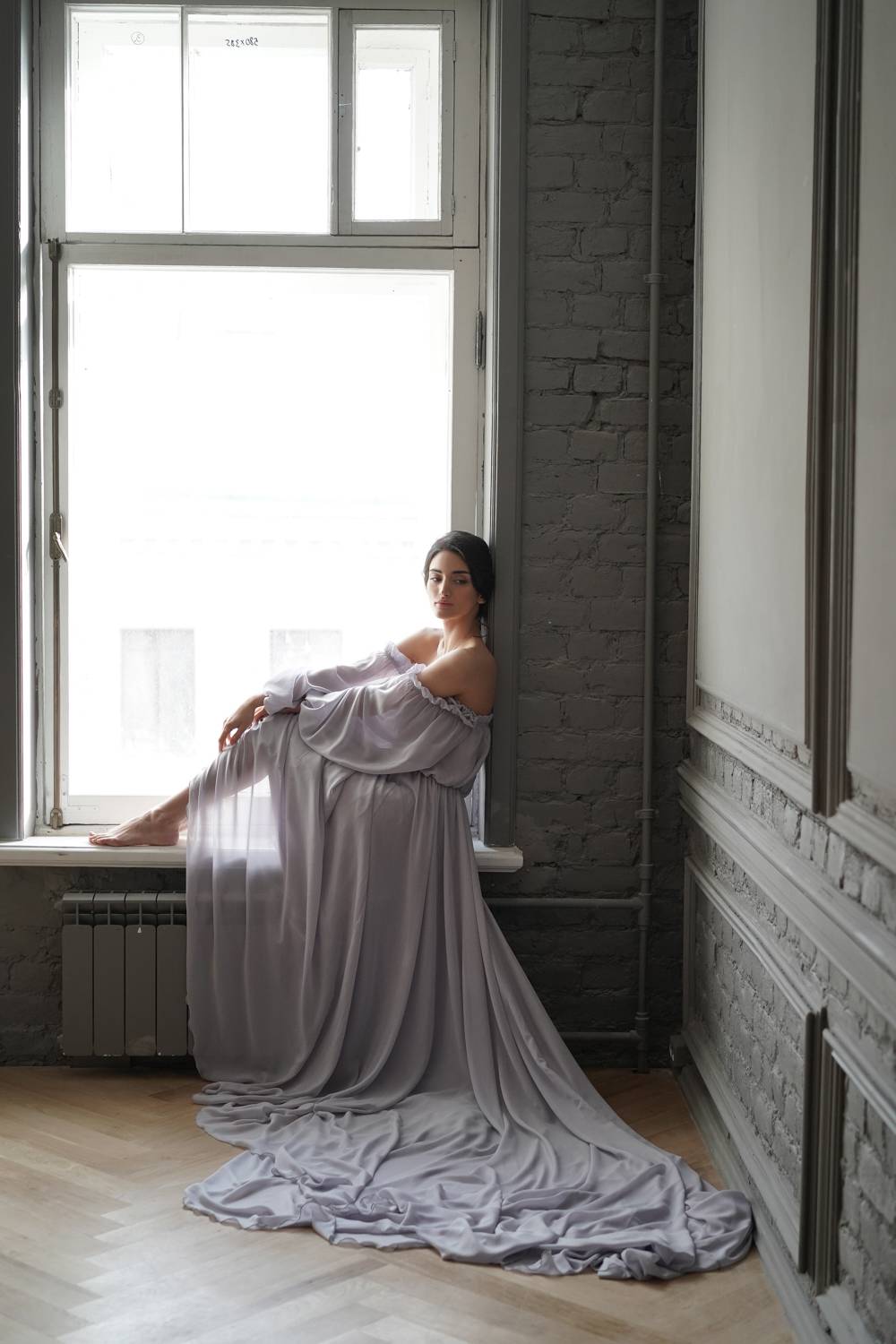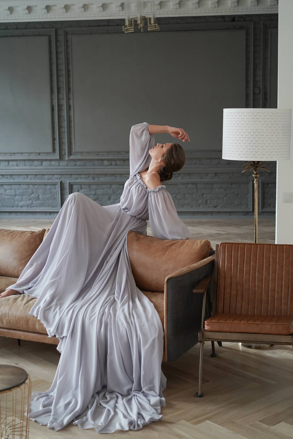 This dress has open shoulders and a long lantern sleeve that falls down, adding grace. The flowing hemline and long train give the dress an incredibly light and chic feel.