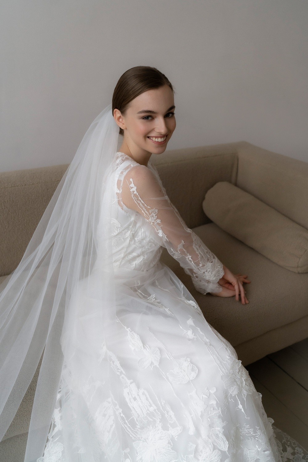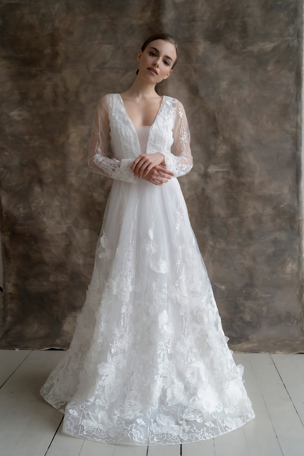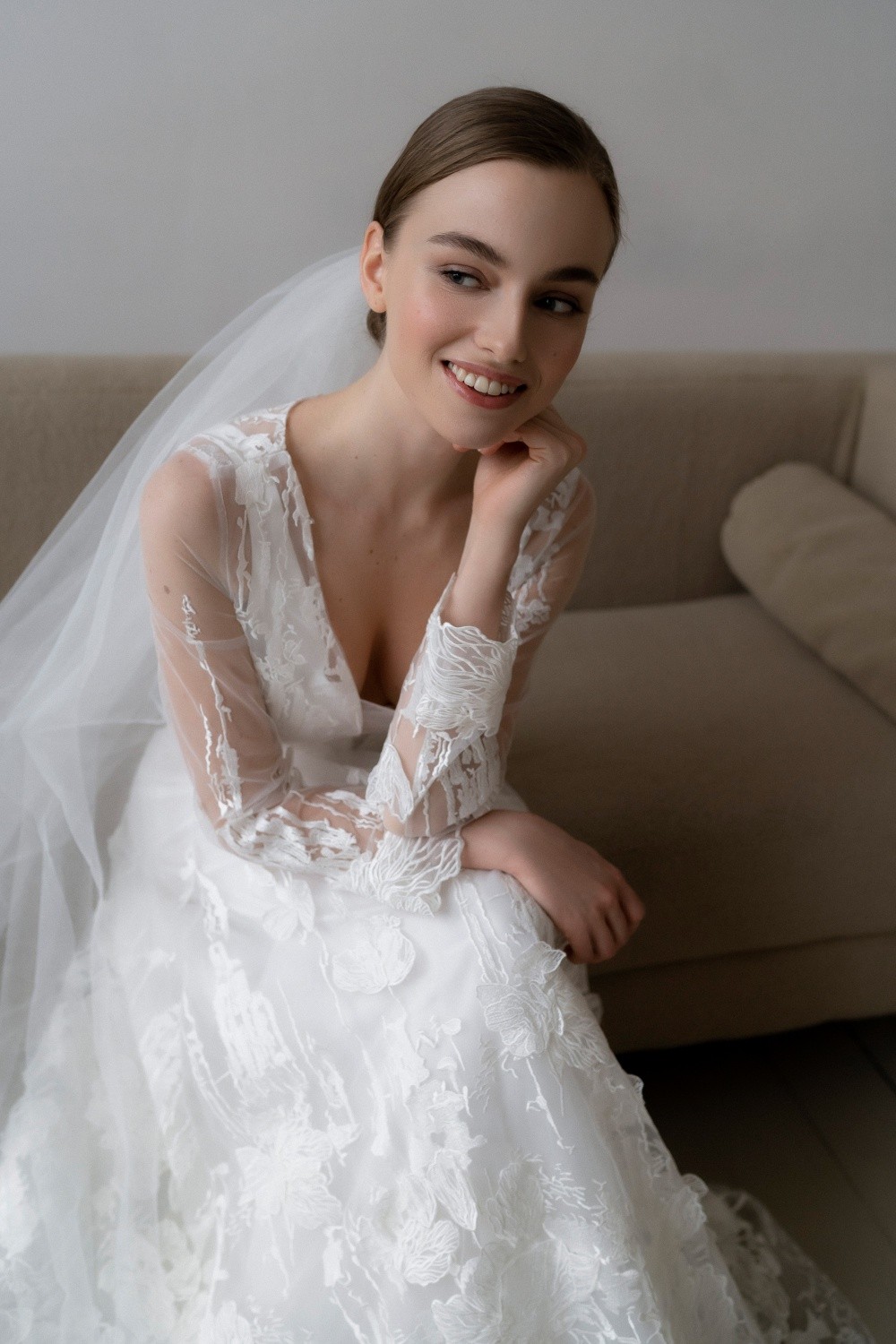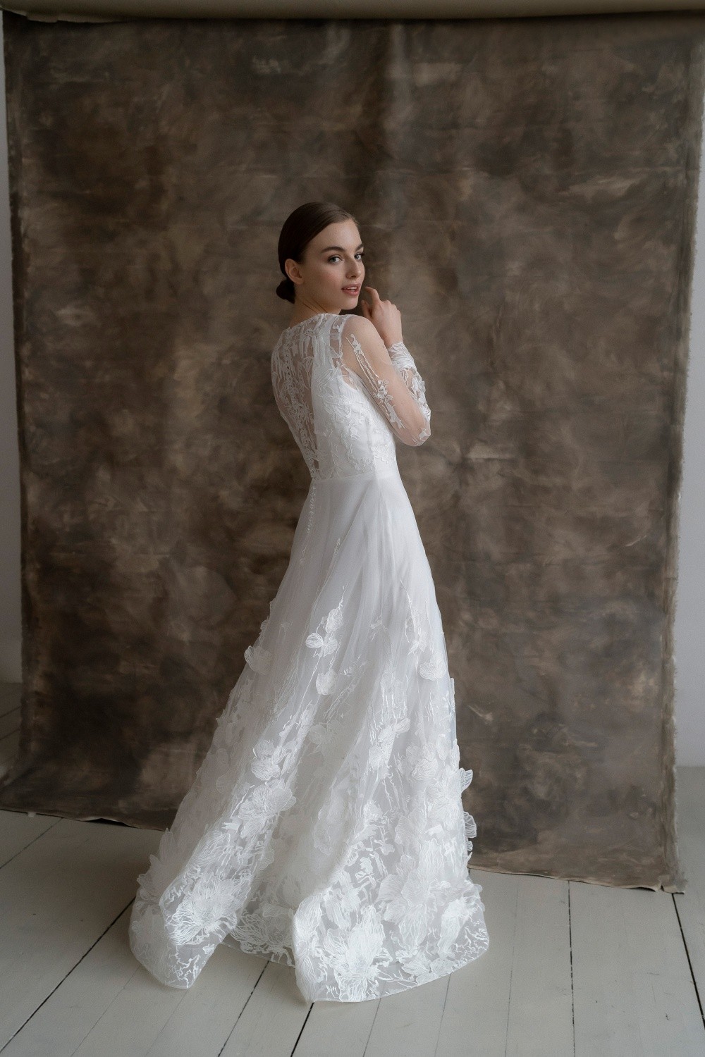 The wedding dress Diana consists of two parts – the upper dress made of lace and the lower one made of satin. The back is completely closed with buttons.