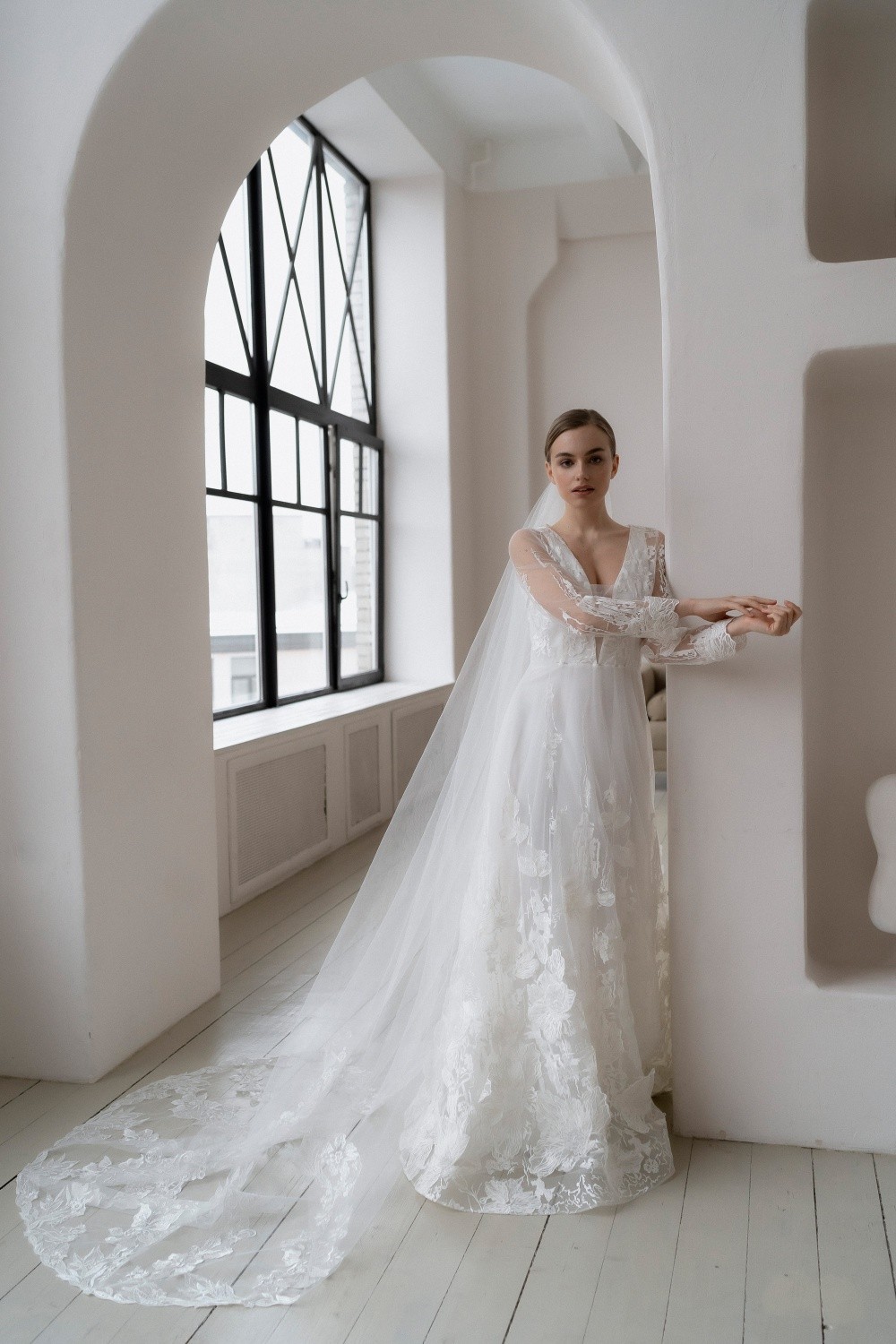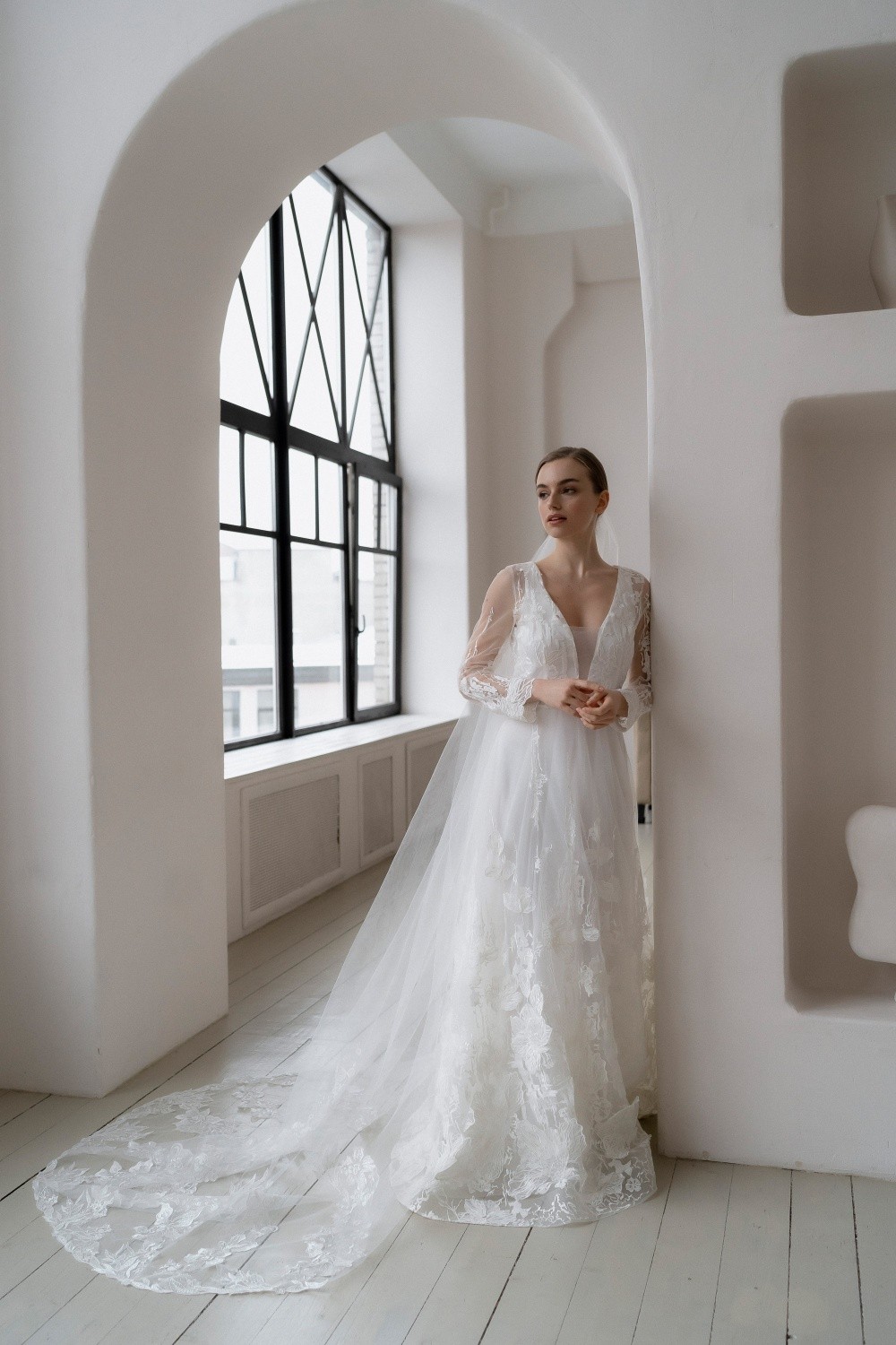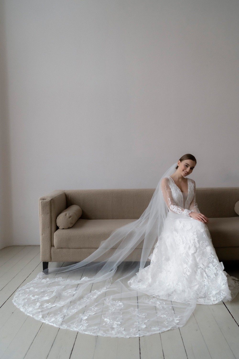 The wedding dress Diana consists of two parts – the upper dress made of lace and the lower one made of satin. The back is completely closed with buttons.