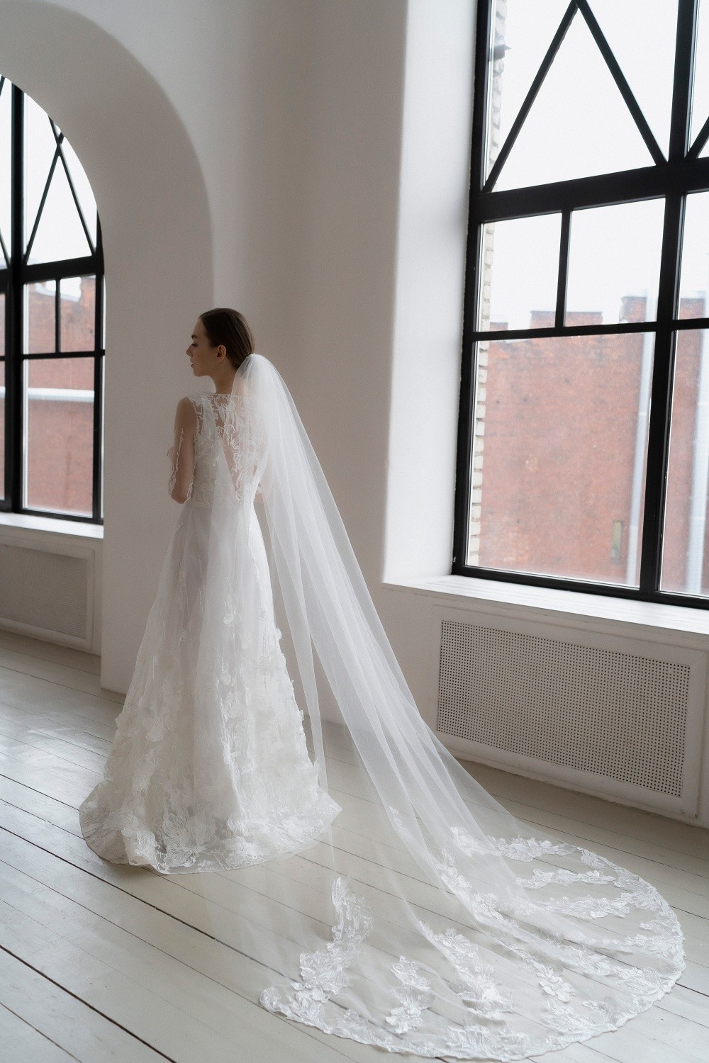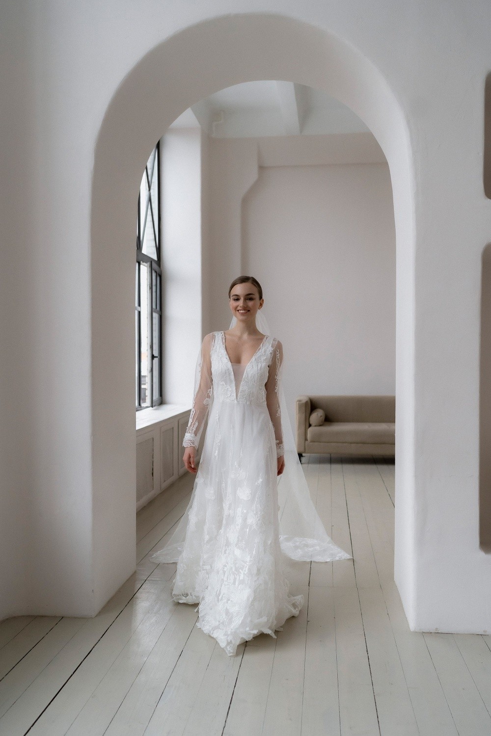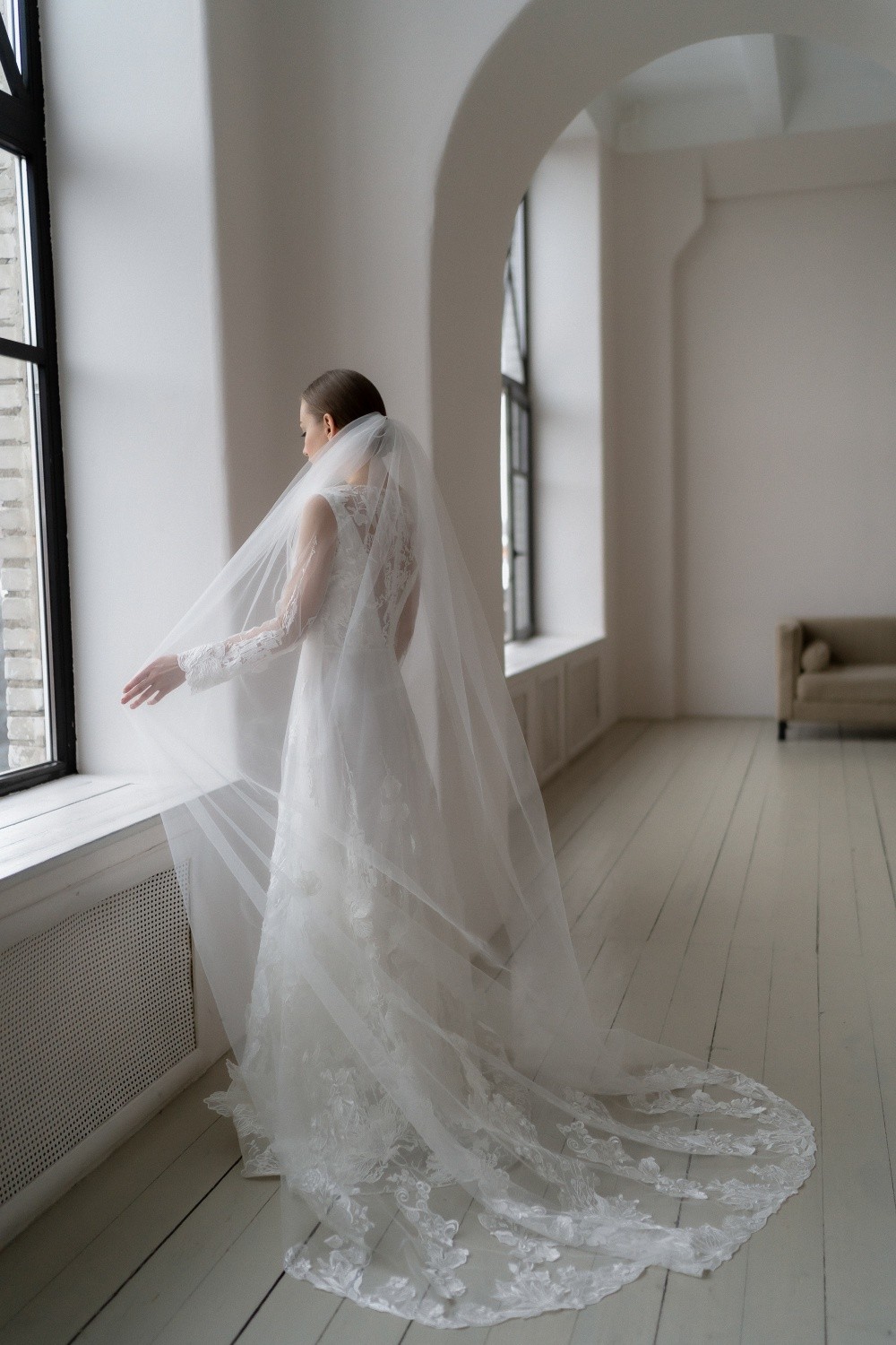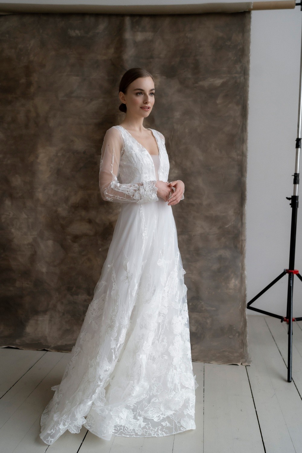 The wedding dress Diana consists of two parts – the upper dress made of lace and the lower one made of satin. The back is completely closed with buttons.