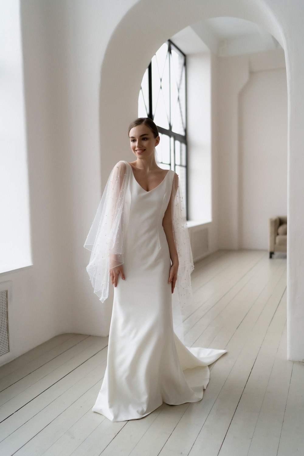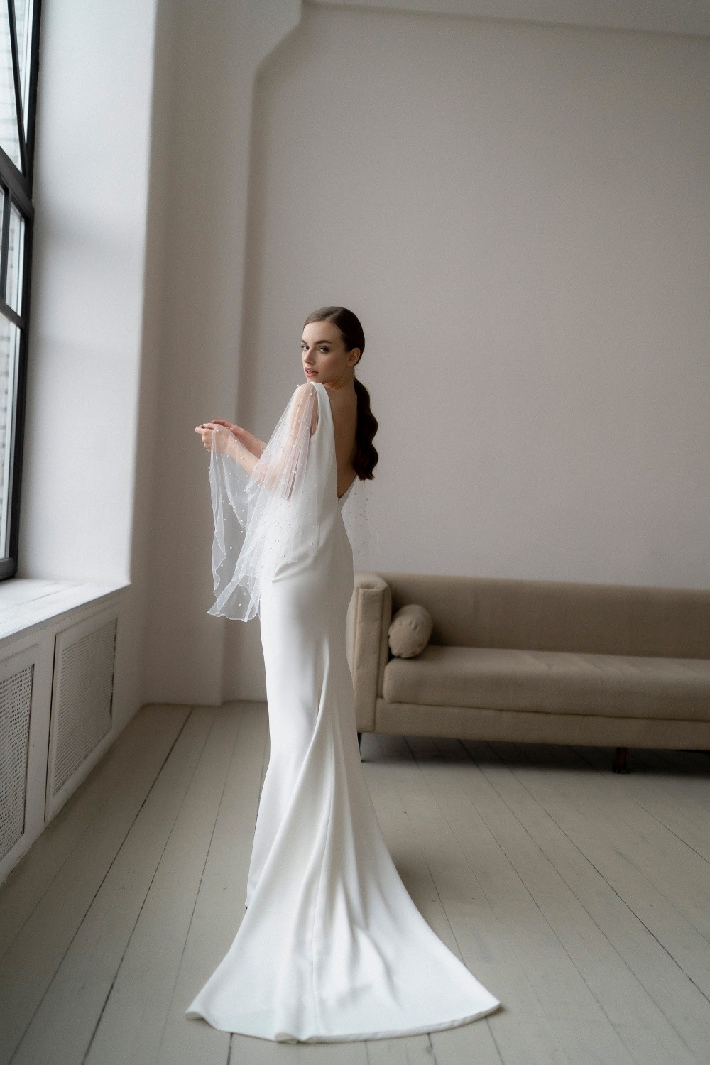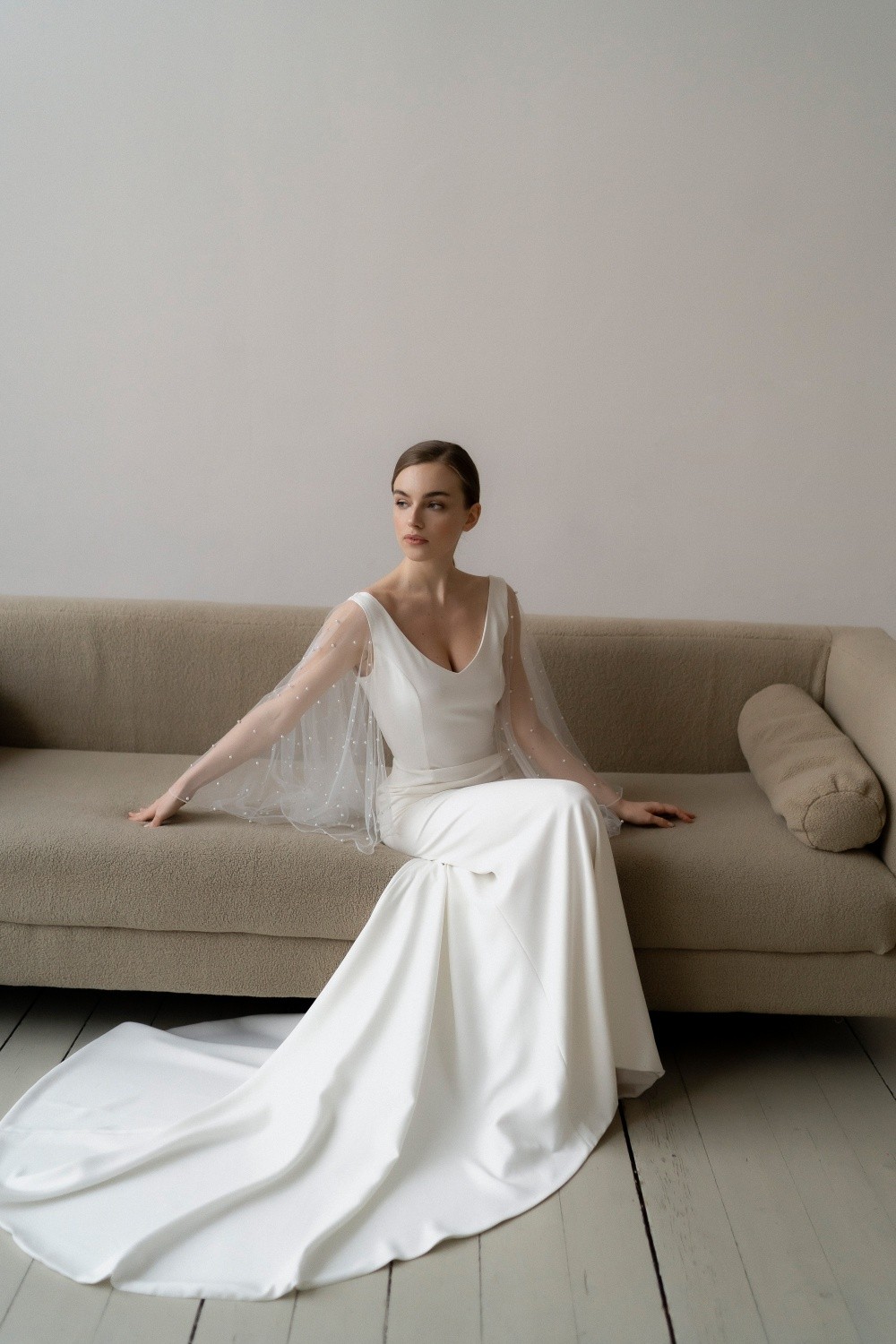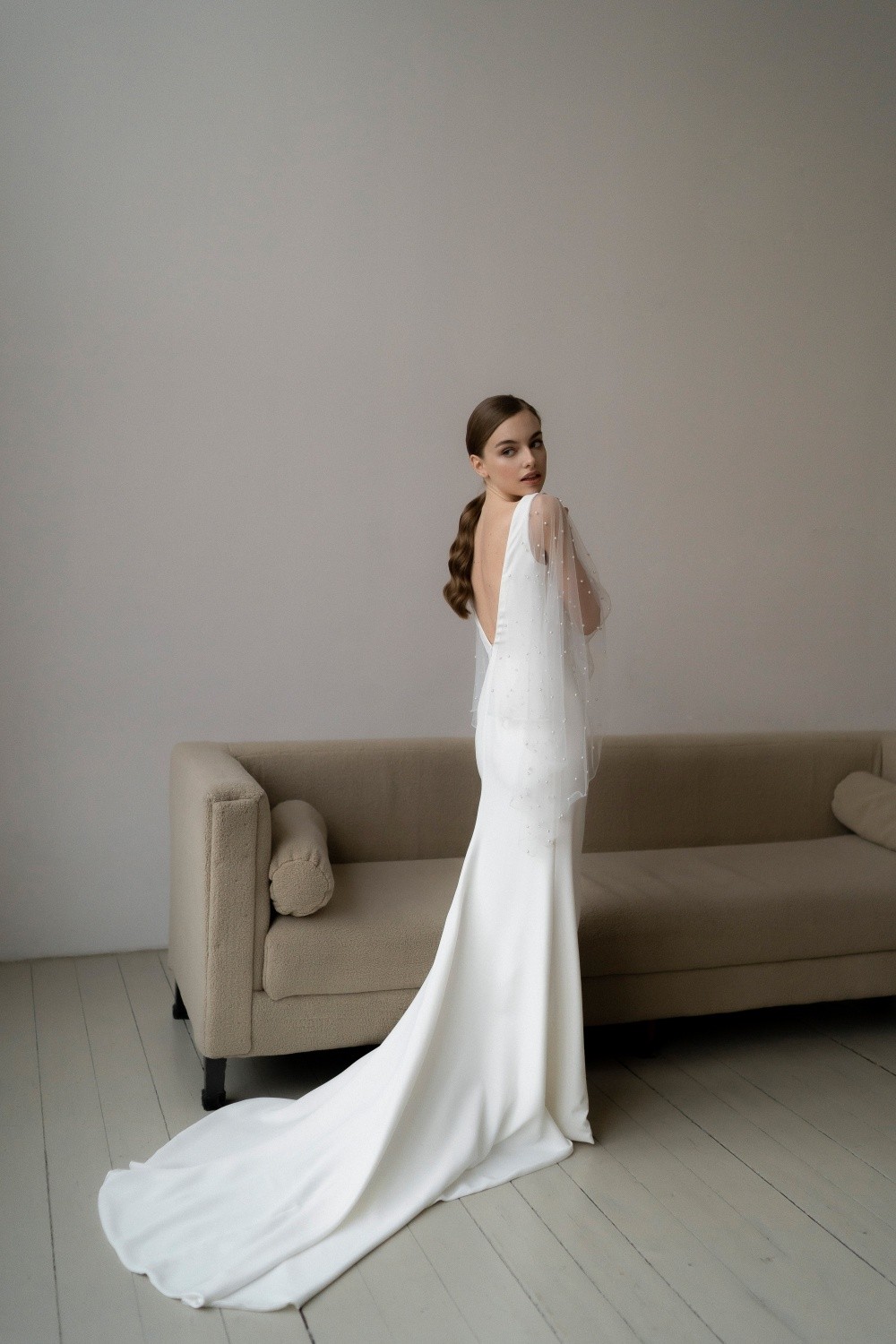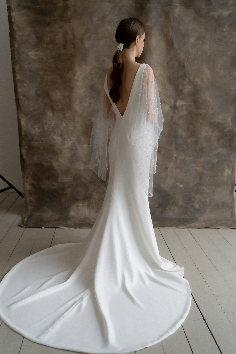 The wedding dress Sara is made in the silhouette of a Fish made of crepe and tulle with pearl beads.