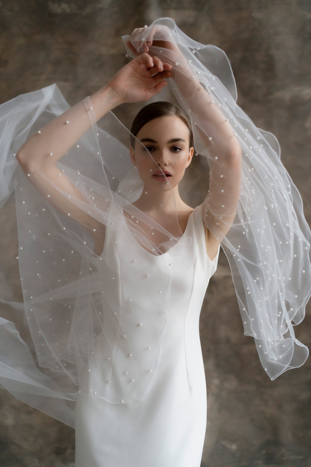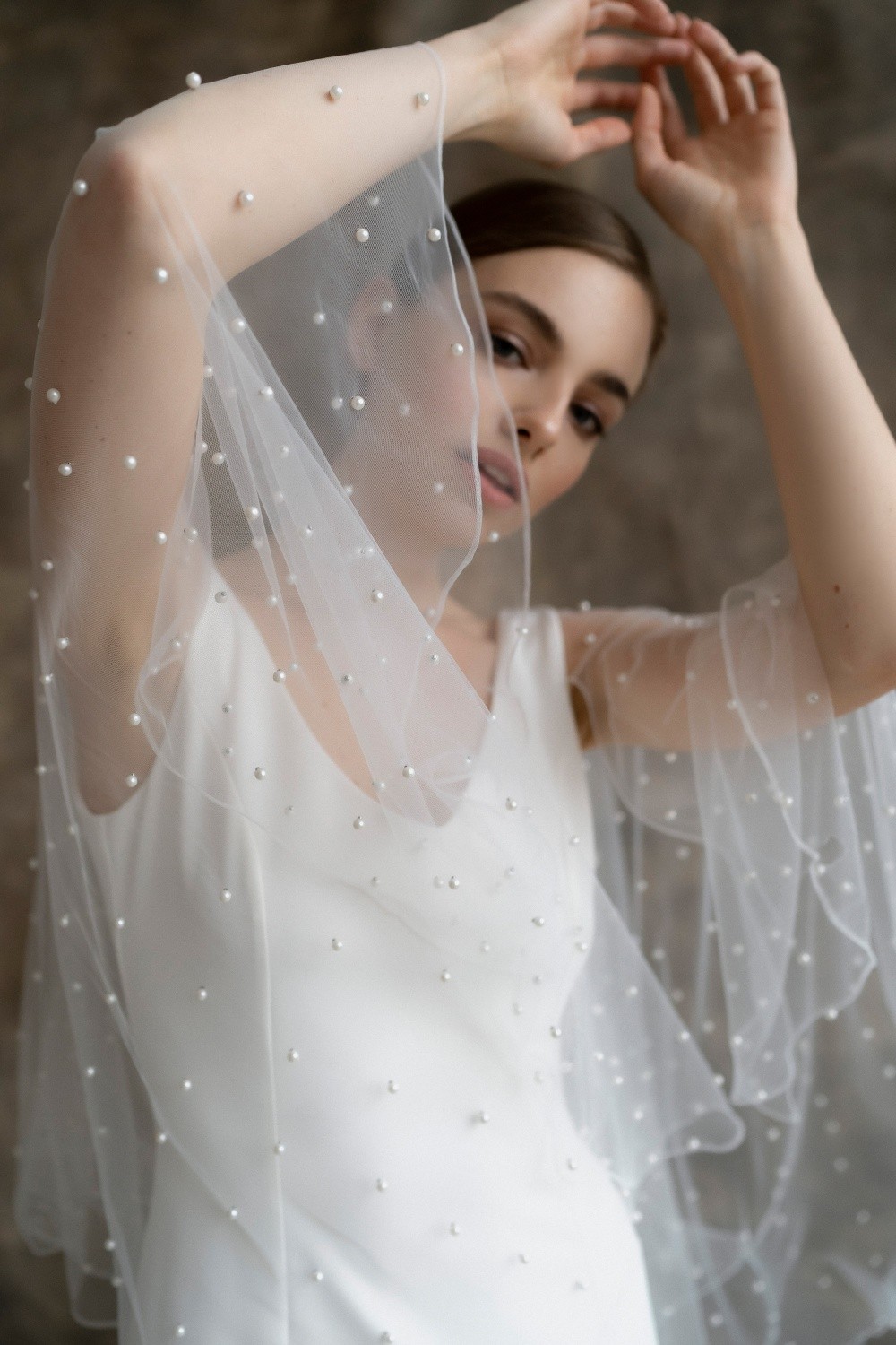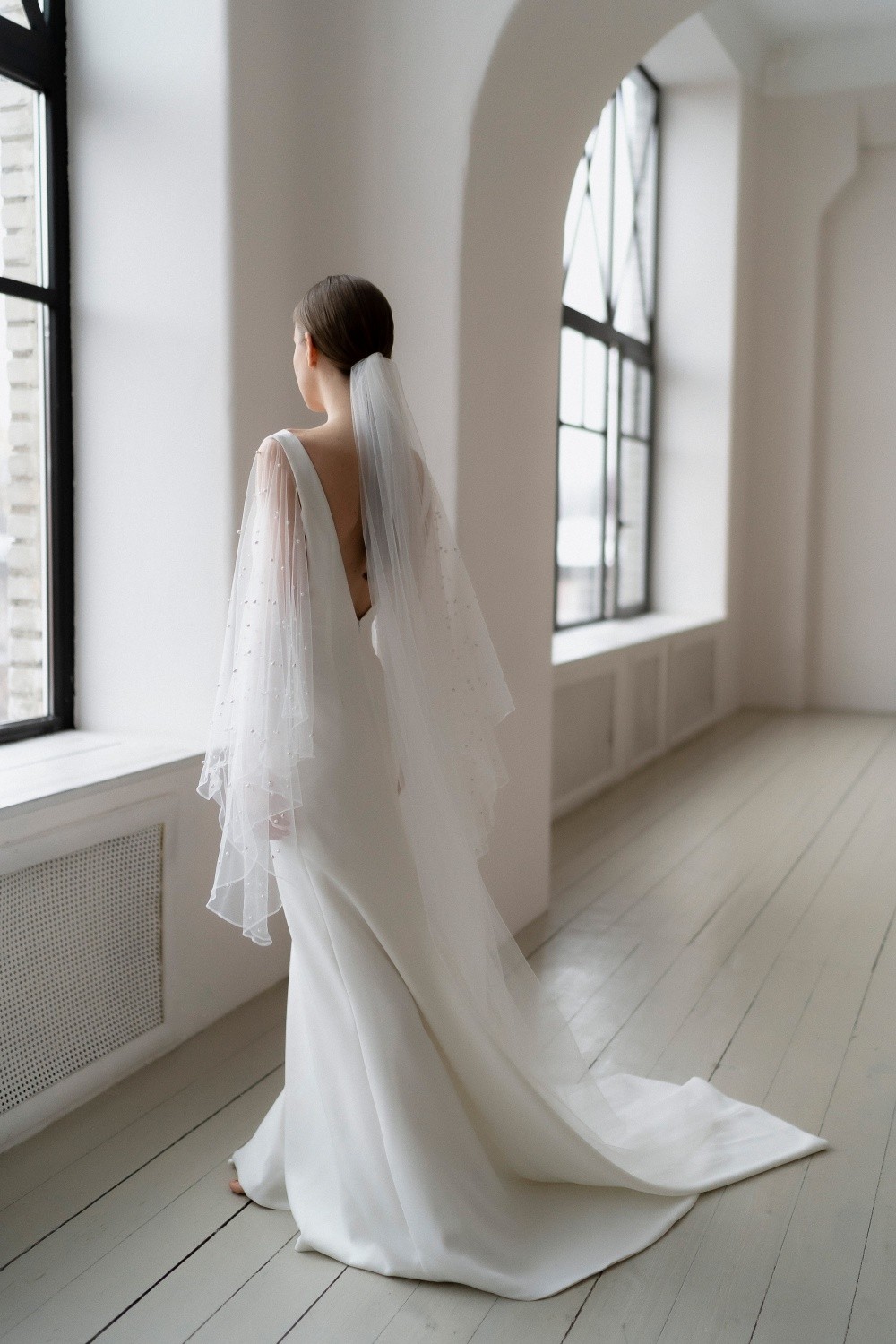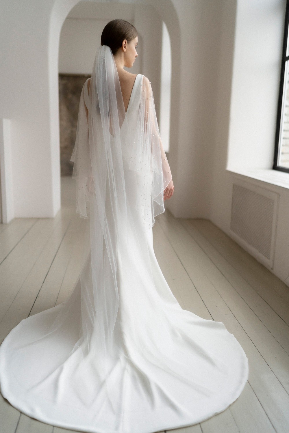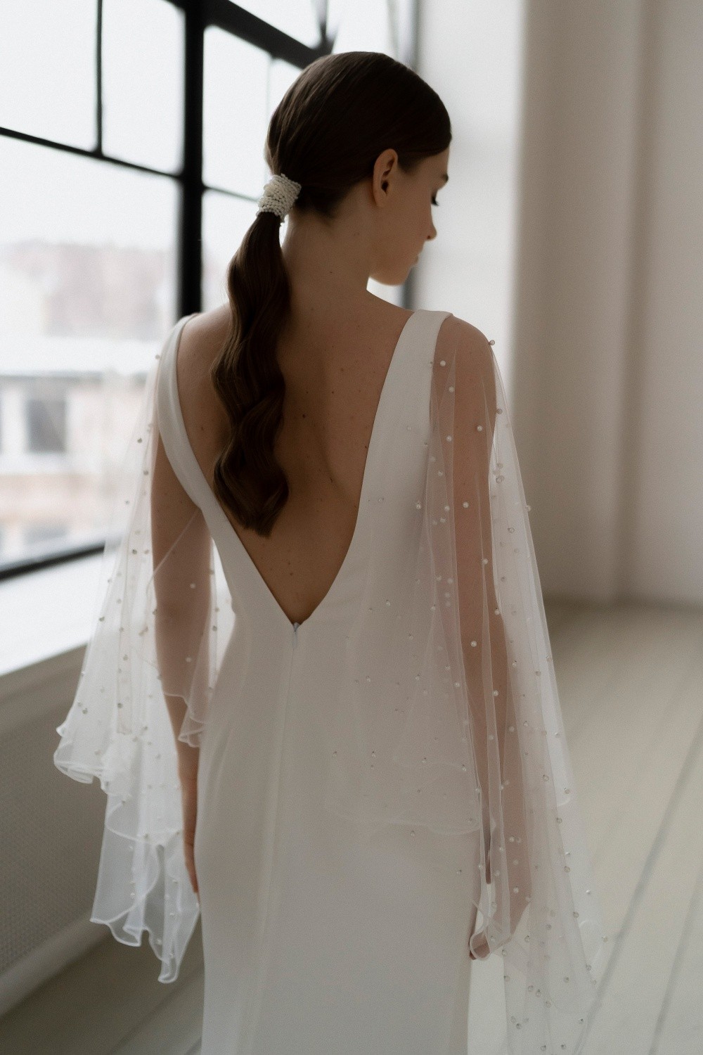 The wedding dress Sara is made in the silhouette of a Fish made of crepe and tulle with pearl beads.