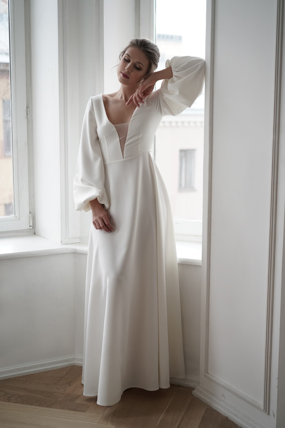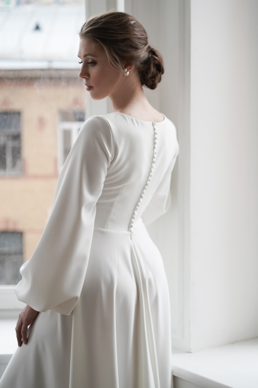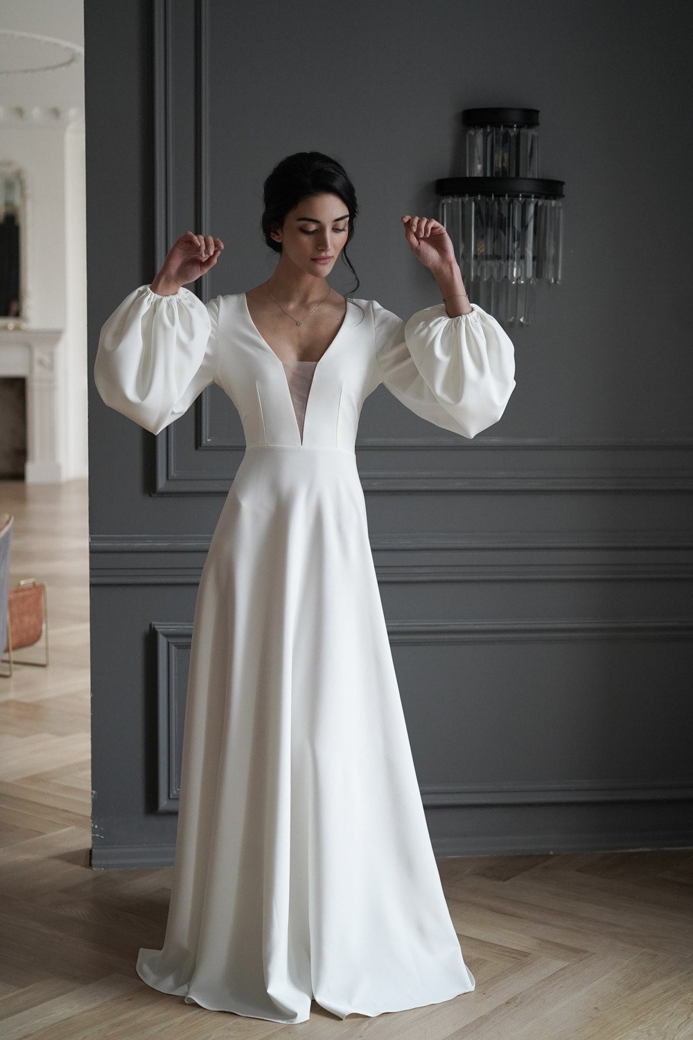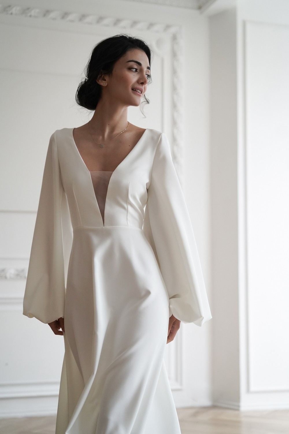 The gorgeous wedding dress is made of crepe.