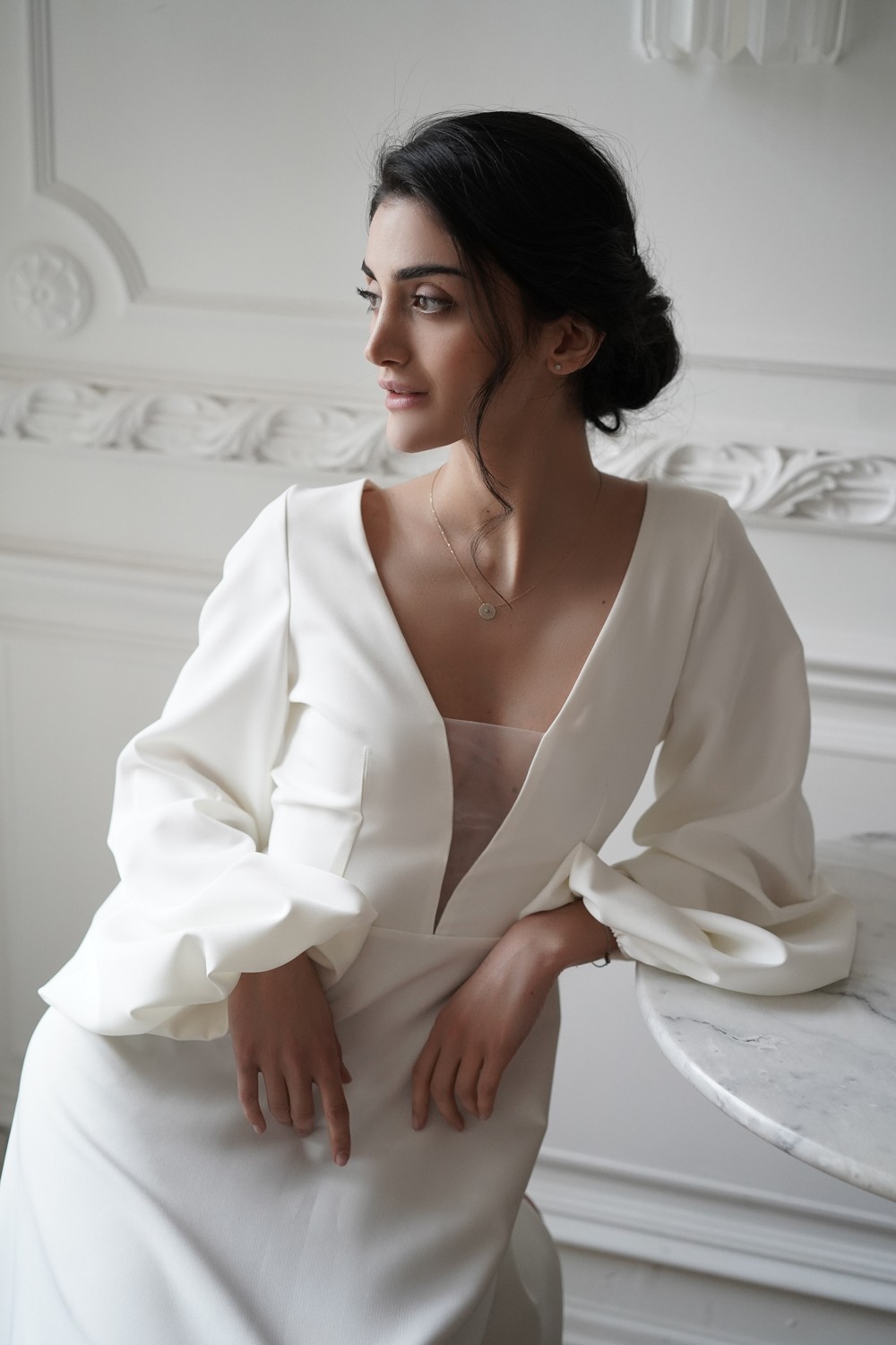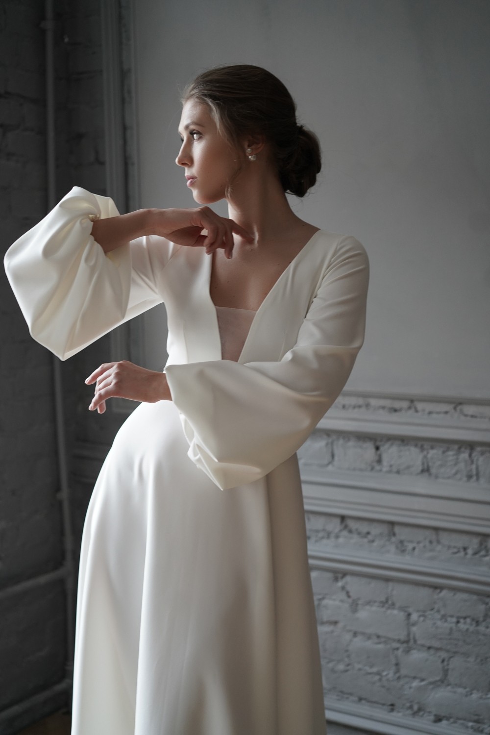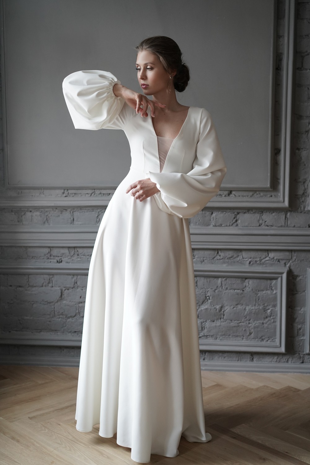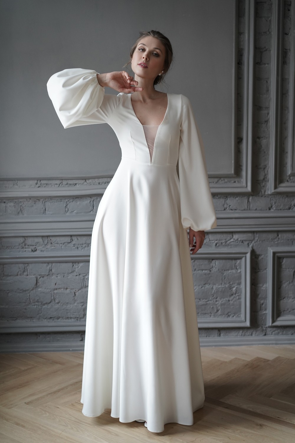 The gorgeous wedding dress is made of crepe.