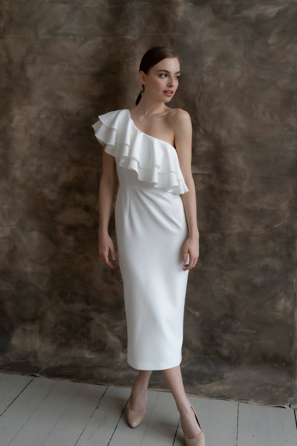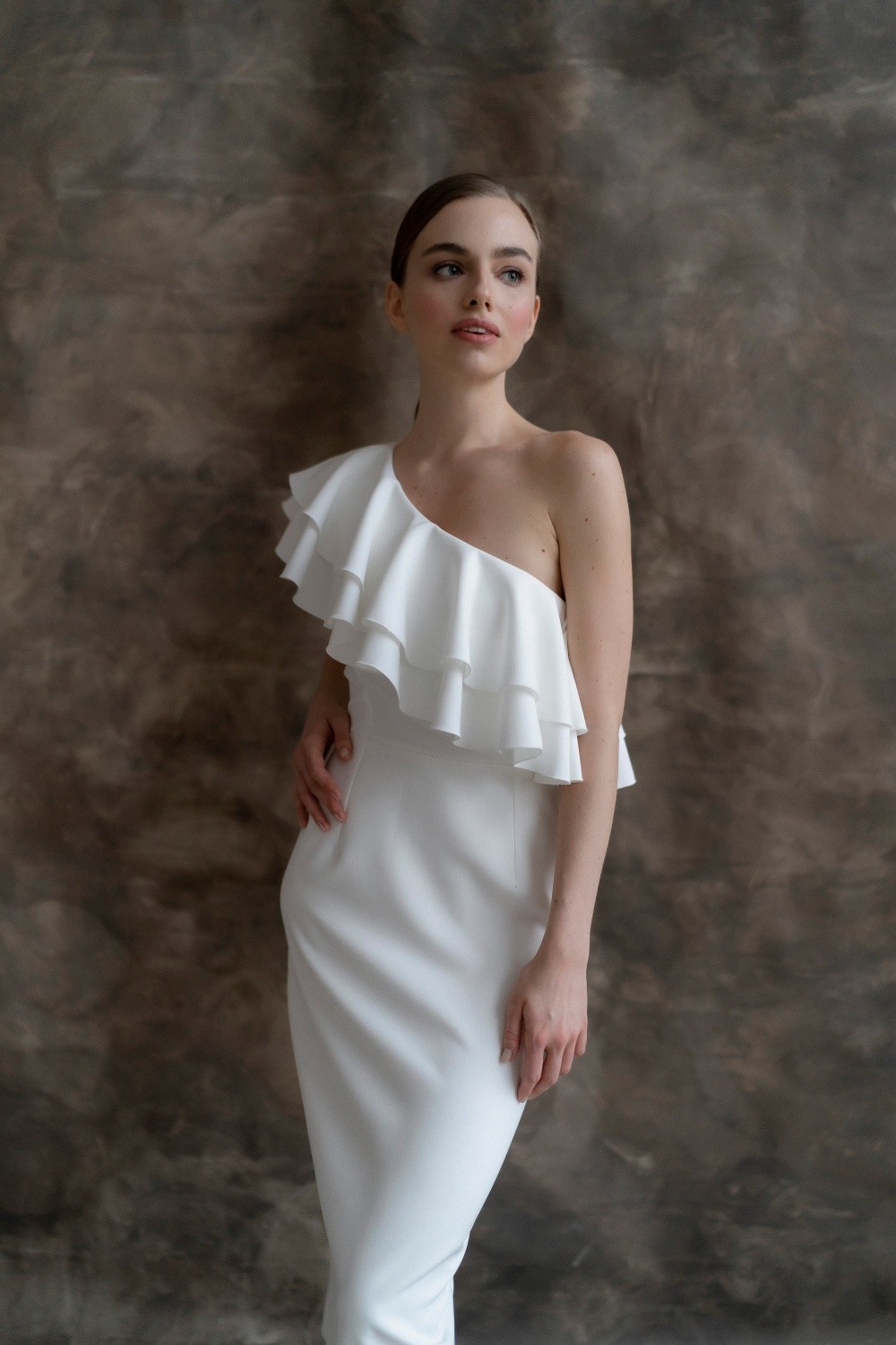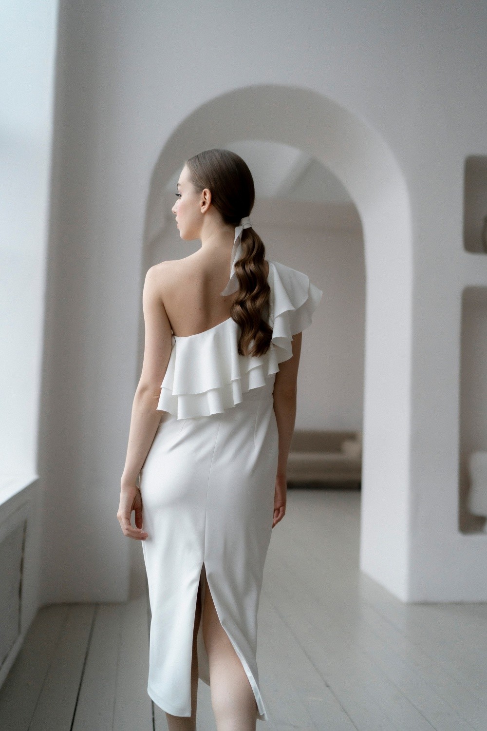 Short wedding dress Zara is made of crepe. The asymmetrical top and flounces effectively emphasize the waist.