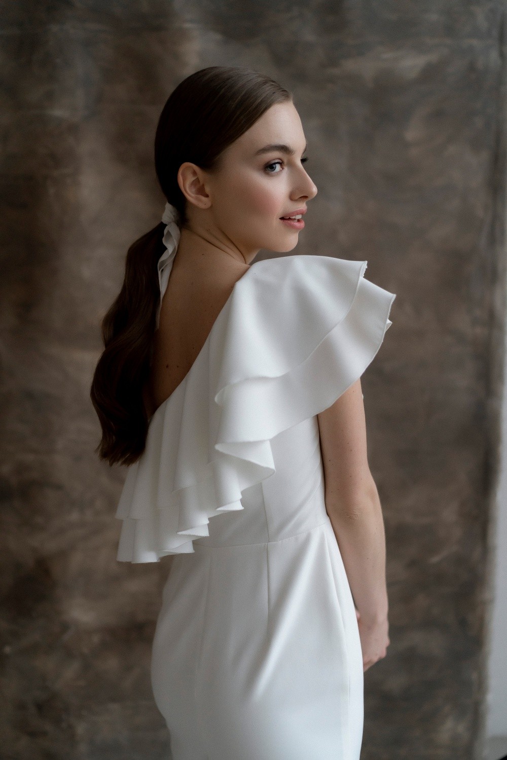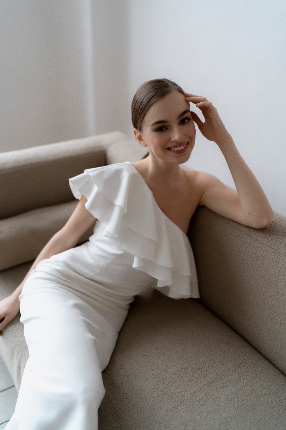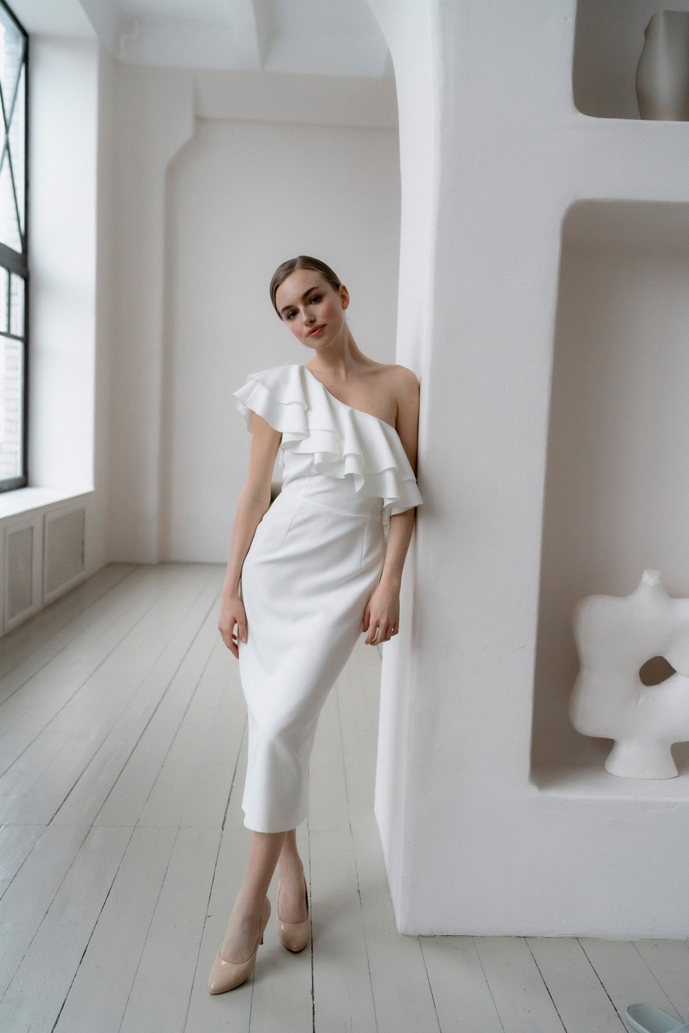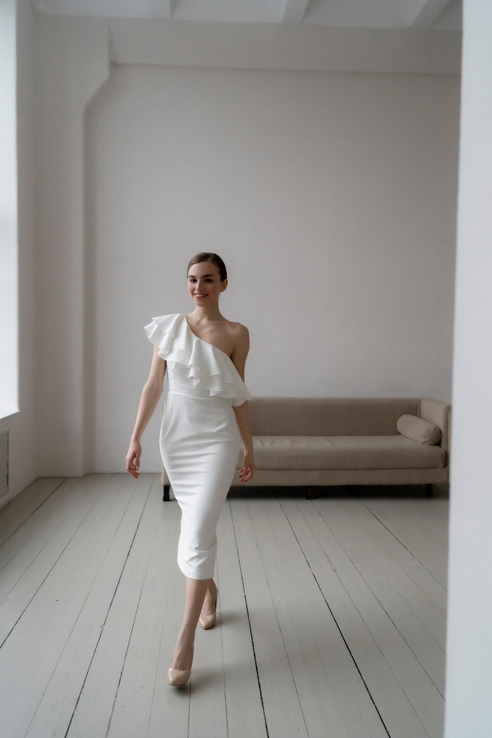 Short wedding dress Zara is made of crepe. The asymmetrical top and flounces effectively emphasize the waist.